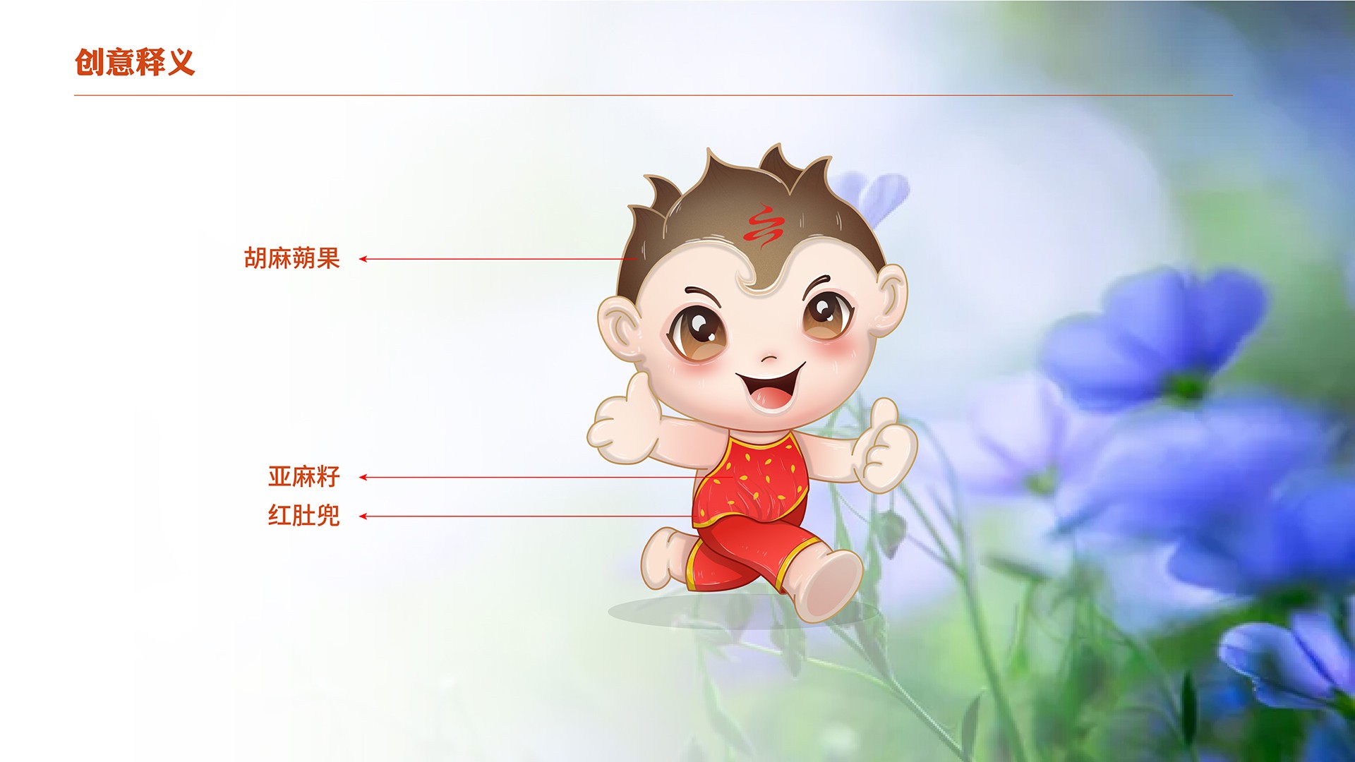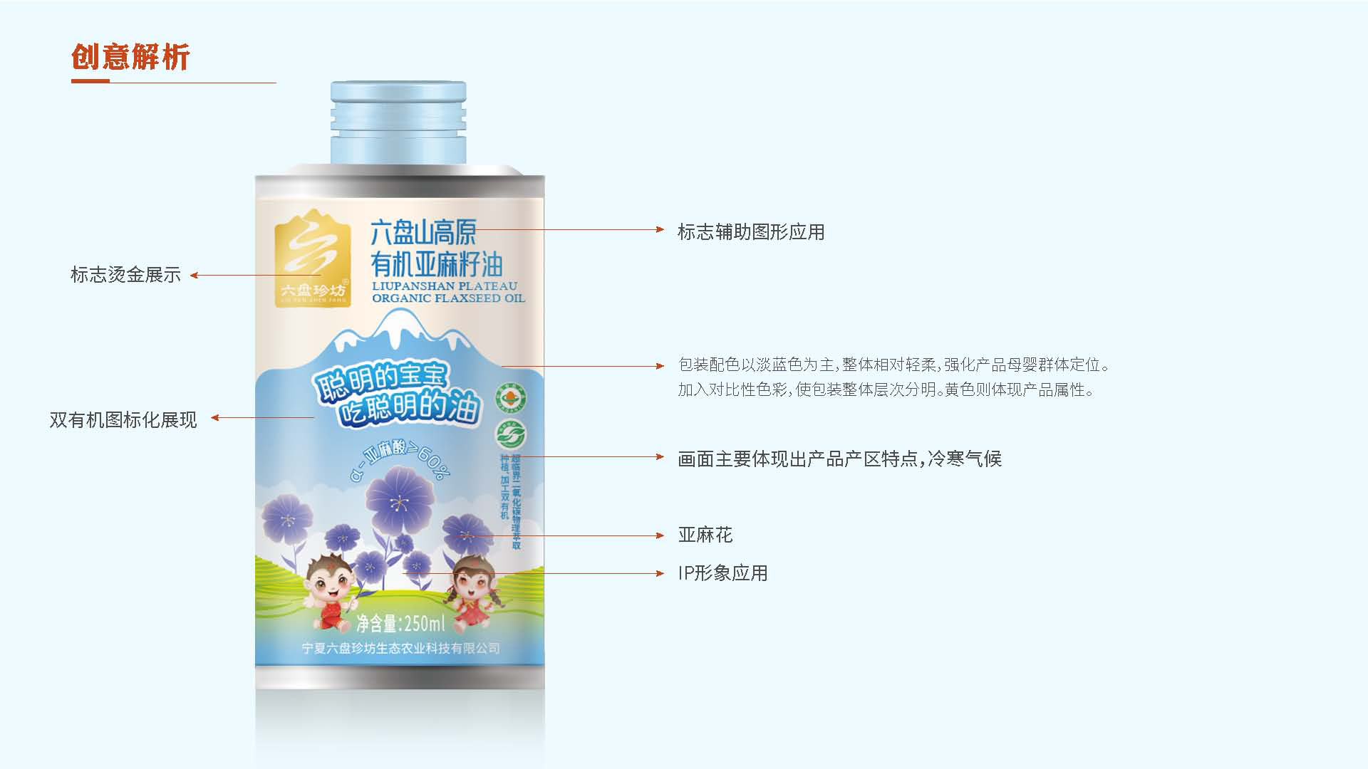 4、產(chǎn)品屬性:亞麻籽油是亞麻花的提取物,在女娃的設(shè)計上綠色手繩為亞麻花葉,衣裙為紫是亞麻花的顏色,裙子上的斑點是亞麻花,裙身下擺整體也勾勒出亞麻花的形態(tài);男娃設(shè)定上,肚兜的斑點為亞麻籽。