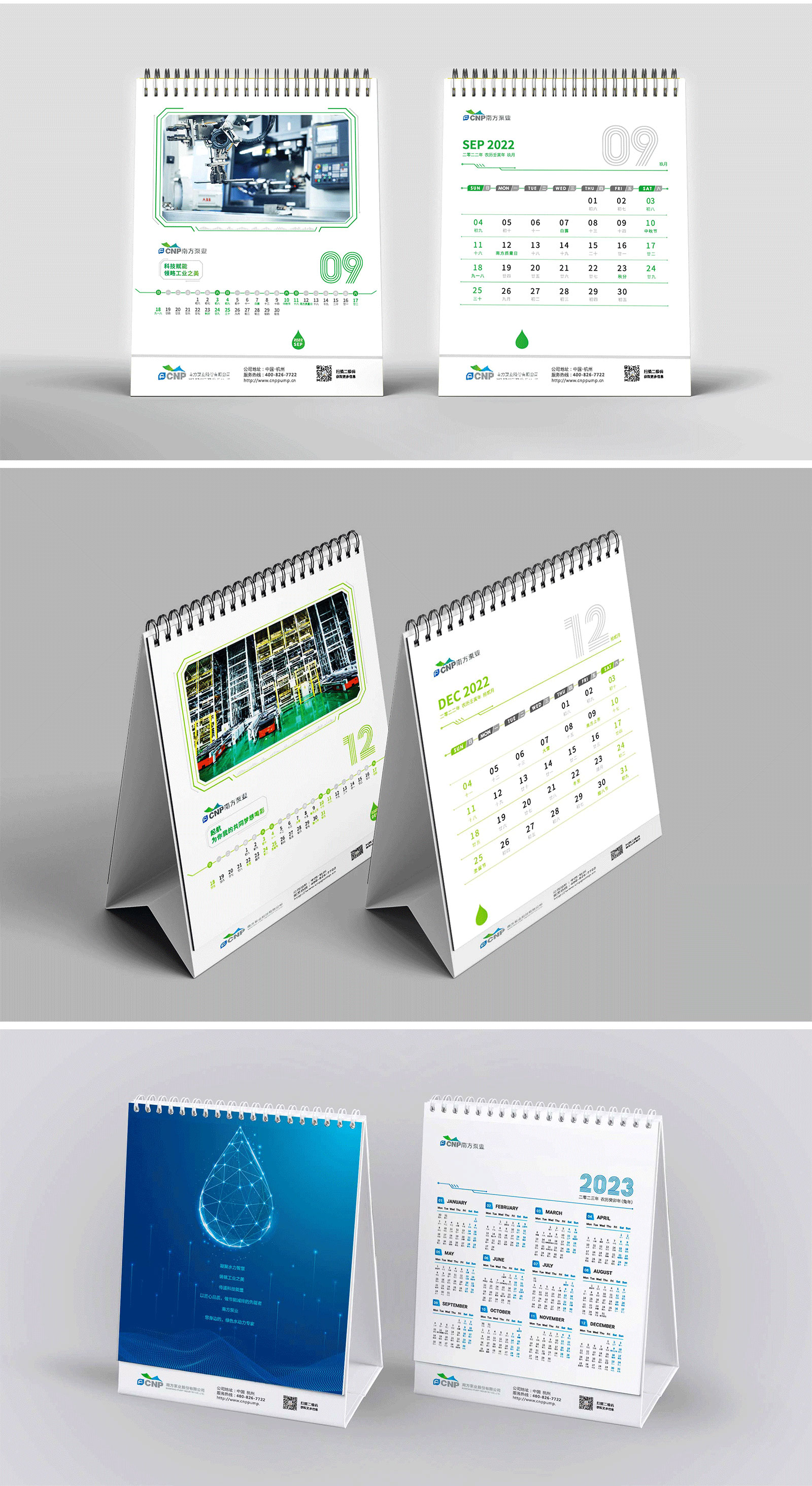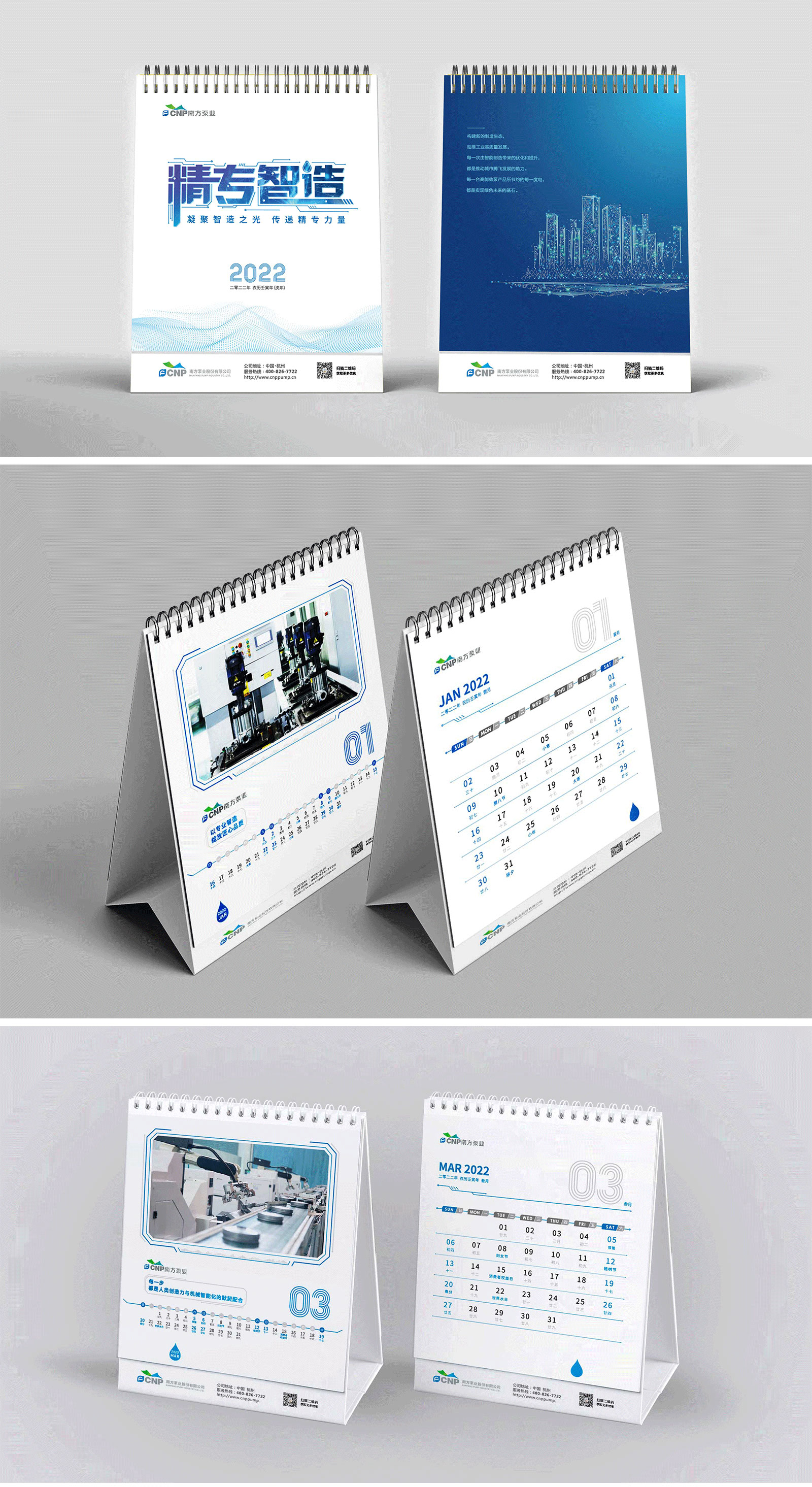 為能更好的突出南方泵業的企業文化及品牌調性,在風格選擇上,石特采取簡約的設計風格,在顏色選擇上,我們考慮到企業屬性,采用以藍色為基本調,彰顯時尚感與科技感。日歷的封面以“精專智造”四個字為主,突出企業的核心優勢,封面字體作了精心設計,視覺呈現上更為直觀、大氣;在日歷內頁上,為能保持實用性與美觀性并存,采取圖文結合的形式進行設計,圖片以南方泵業的產品圖為主,底部標注月份、日期,其重點突出,層次明晰,一目了然。