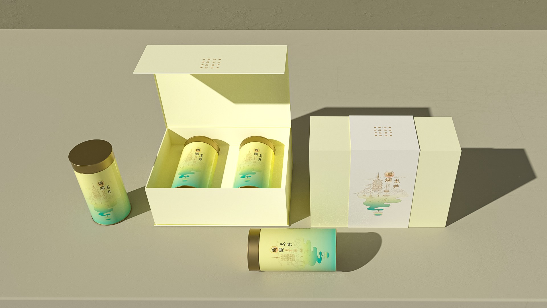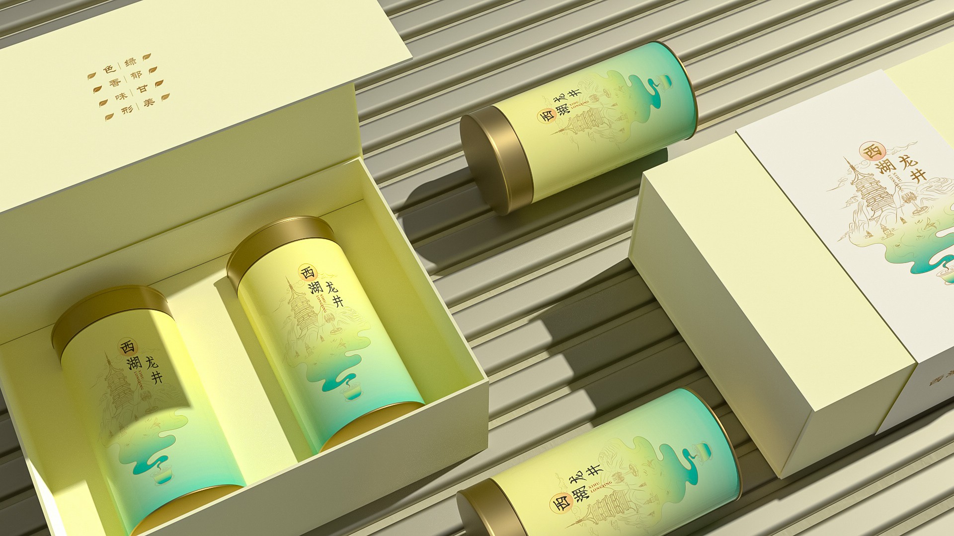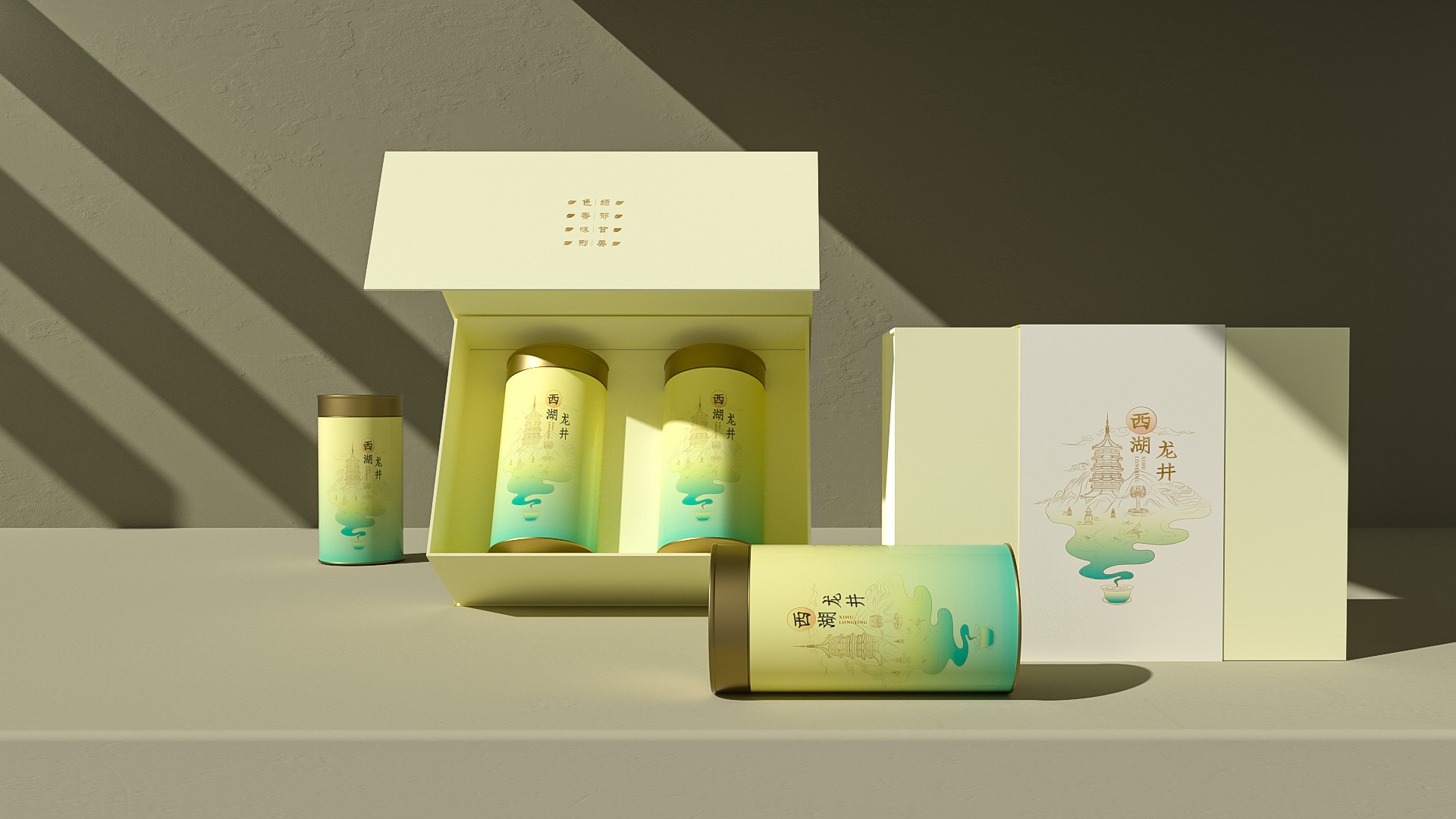“西湖形勝”包裝設計設計思路:當西湖標志景點與龍井茶元素在禮盒相遇,一幅流動的山水畫卷徐徐展開,這便是我們為您呈現的“西湖形勝”禮盒,每一處細節都訴說著國茶的新篇章。