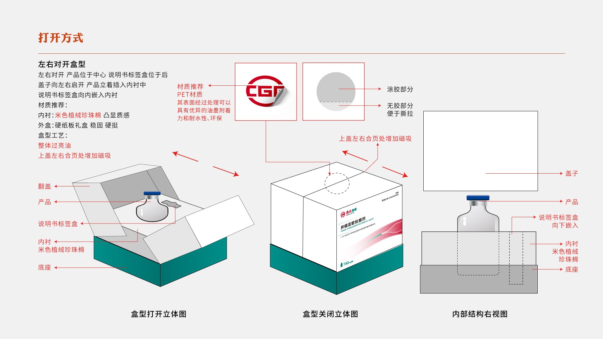 腫瘤溫敏栓塞劑作用于肝癌腫瘤患者,該醫(yī)療器械需取放便捷,我們采用雙開(kāi)門(mén)的開(kāi)口方式,開(kāi)口處有磁吸與標(biāo)貼,雙重防護(hù),標(biāo)貼并非全覆蓋粘貼,有涂膠與非涂膠部分,在保證產(chǎn)品安全的同時(shí)不失便捷。