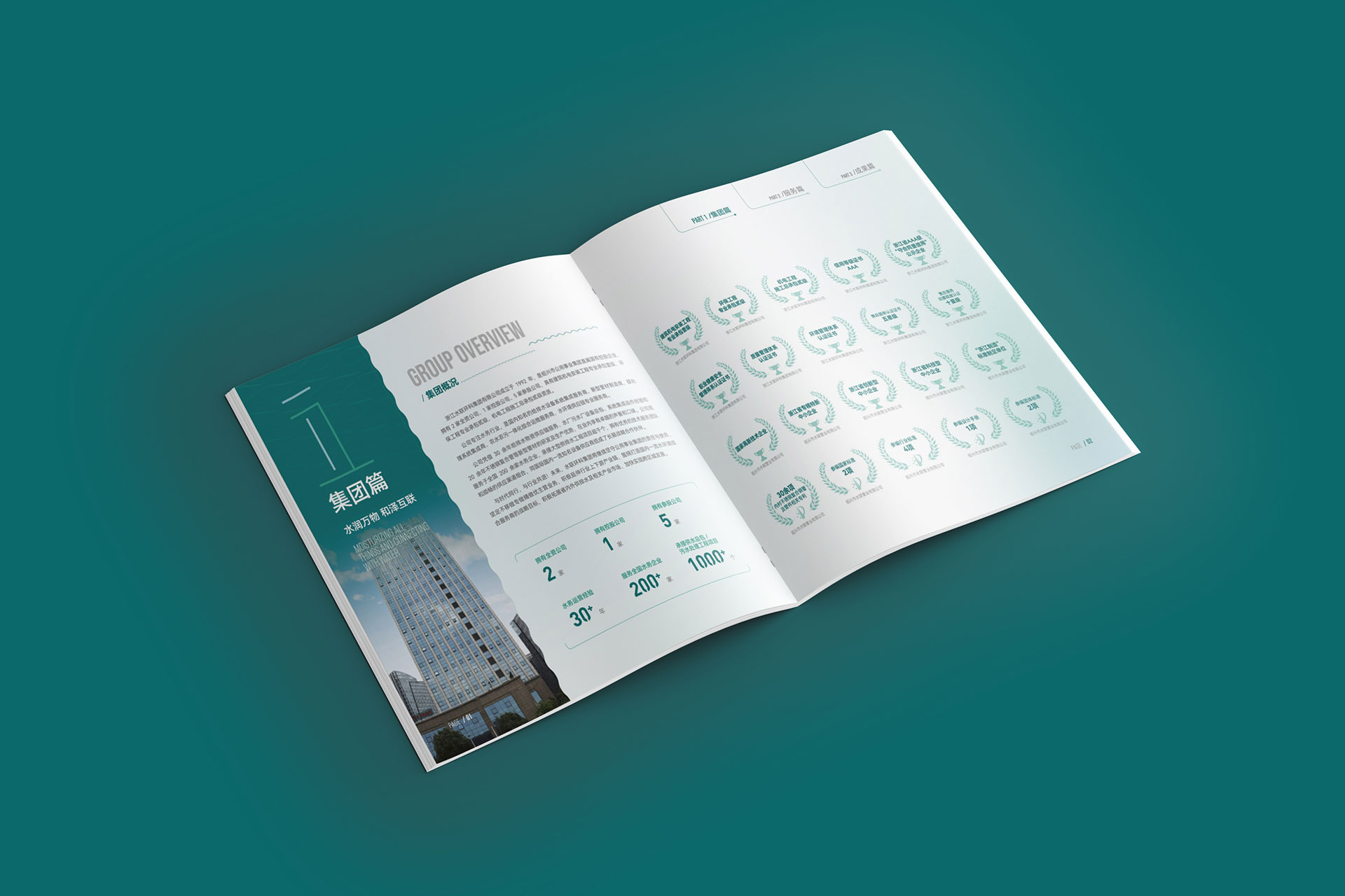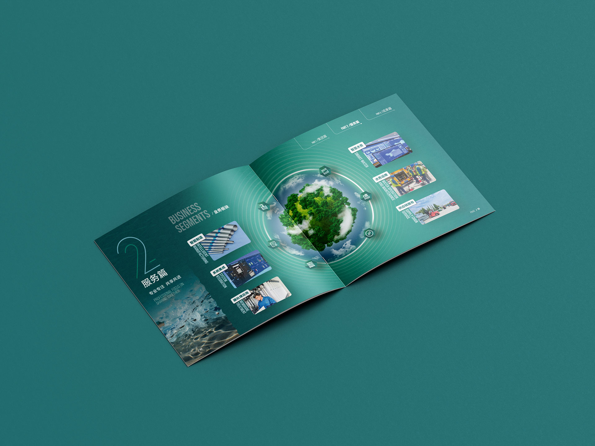 1?? 科技藍×生態綠碰撞 封面以深海藍為主基調,疊加動態水波紋光效與分子結構抽象線條,內頁融合實拍水廠工程圖與3D技術拆解動畫,硬核科技與生態美學并存,呼應“水聯萬物,科創新生”品牌理念。 2?? 復雜業務可視化 將“不銹鋼復合管生產”“設備集成總包”等專業業務,轉化為“全產業鏈流程圖+數據看板”,搭配中英雙語解讀,政府匯報、國際招商場景通吃!更用“年均6.5億營收”“國家高新企業”等關鍵數據強化行業地位。 3?? 沉浸式場景營銷 借鑒頭部環保畫冊設計思路,通過航拍水處理廠、微觀水質凈化對比實驗等創意攝影,打造“一滴水的凈化之旅”敘事線,讓客戶秒懂技術價值。
