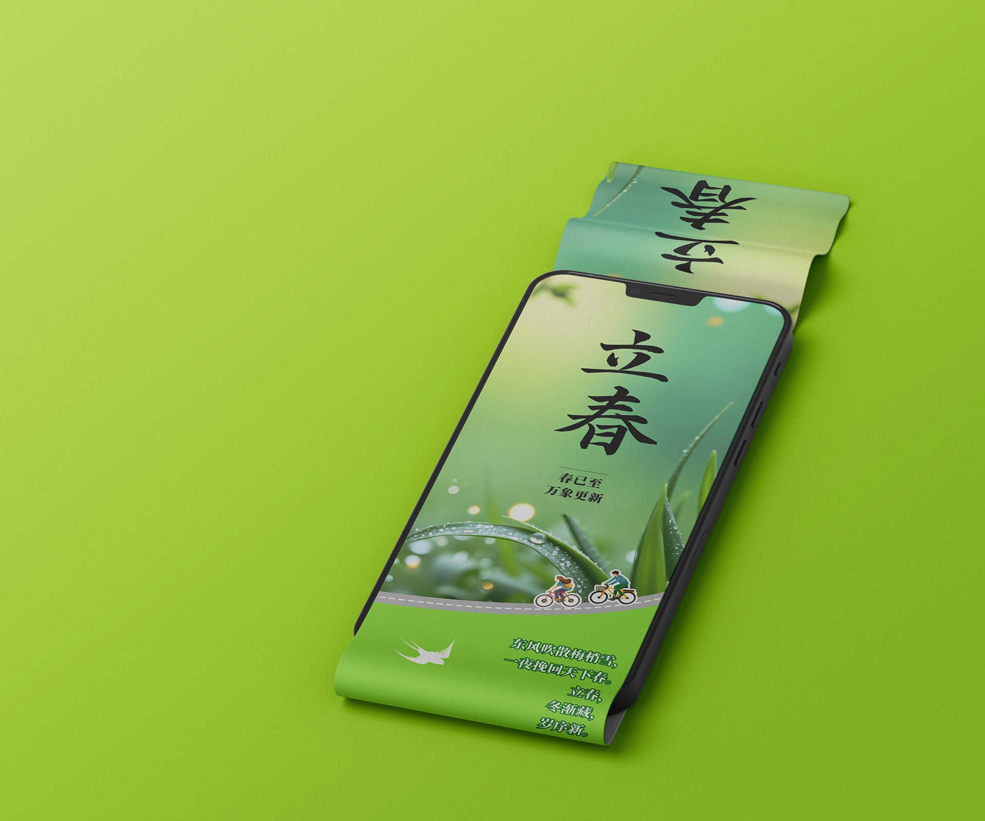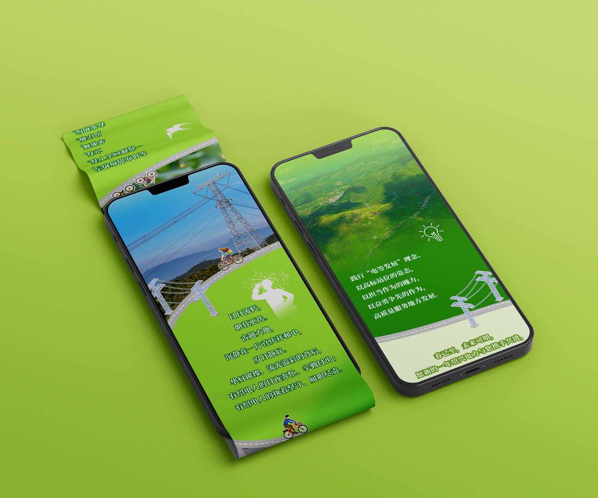 融合傳統(tǒng)與現(xiàn)代元素:設(shè)計團(tuán)隊以綠色為主色調(diào),契合立春萬物復(fù)蘇的氛圍。畫面中融入燕子、春花等經(jīng)典立春元素,同時將電力設(shè)施以藝術(shù)化的形式展現(xiàn),比如把電線桿設(shè)計成竹子的造型,寓意電力服務(wù)像竹子一樣堅韌且節(jié)節(jié)高升,實現(xiàn)傳統(tǒng)與現(xiàn)代元素的有機(jī)融合。