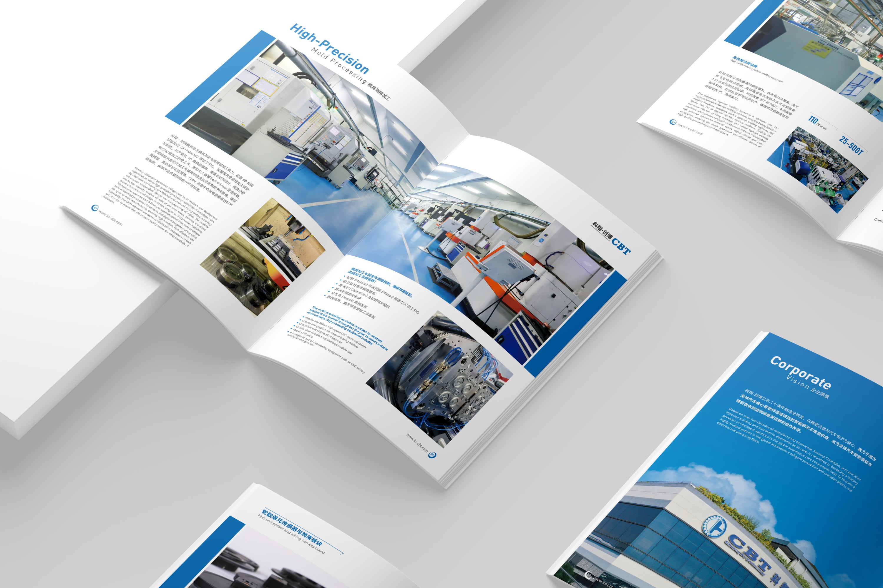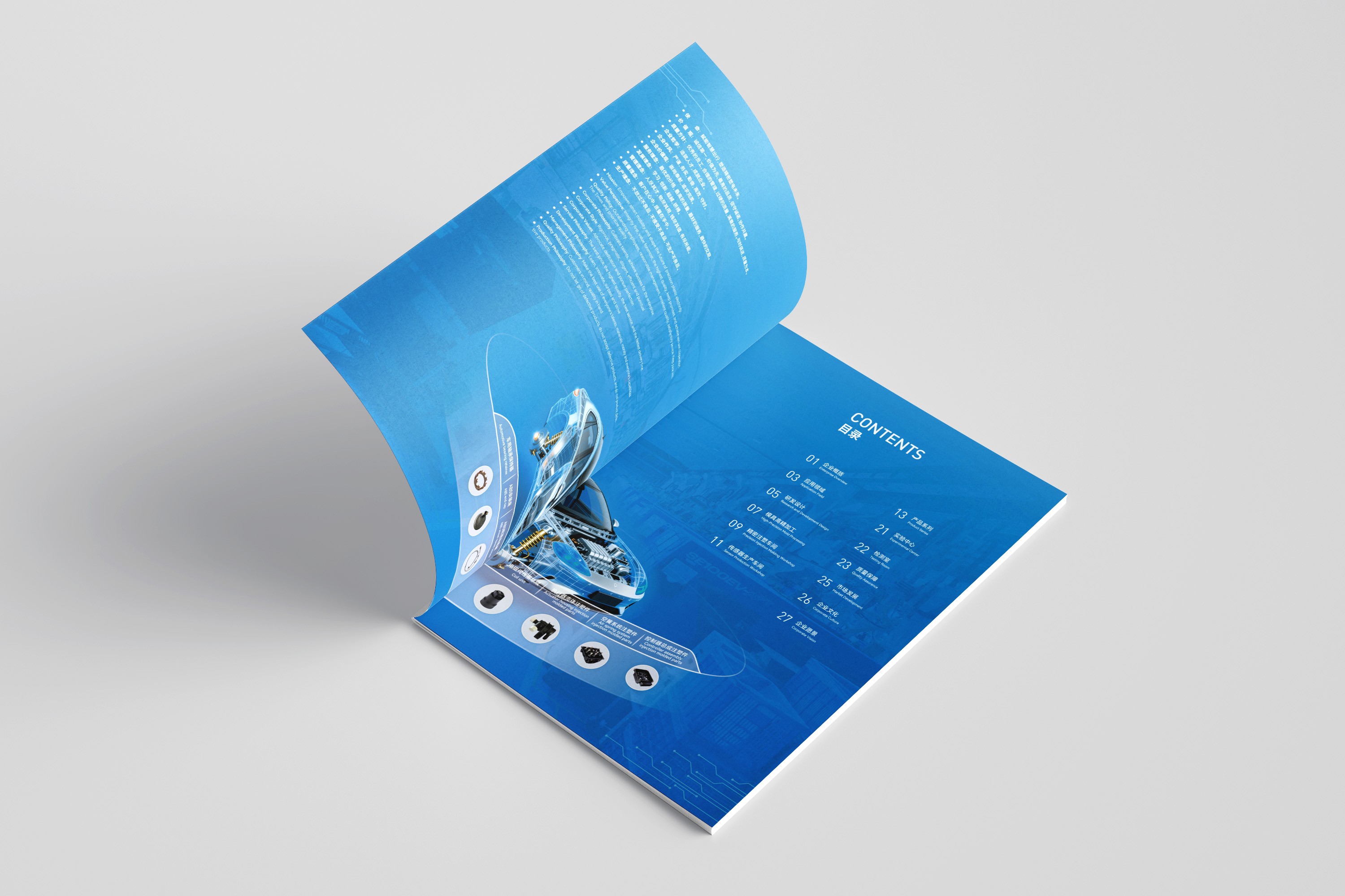 中英雙語與國際接軌: 考慮到汽車產(chǎn)業(yè)鏈的全球化特性,畫冊內(nèi)容采用中英雙語編排,設(shè)計上確保雙語排版的規(guī)范與美觀,滿足創(chuàng)博科技開拓國際業(yè)務(wù)、對接海外客戶的溝通需求。