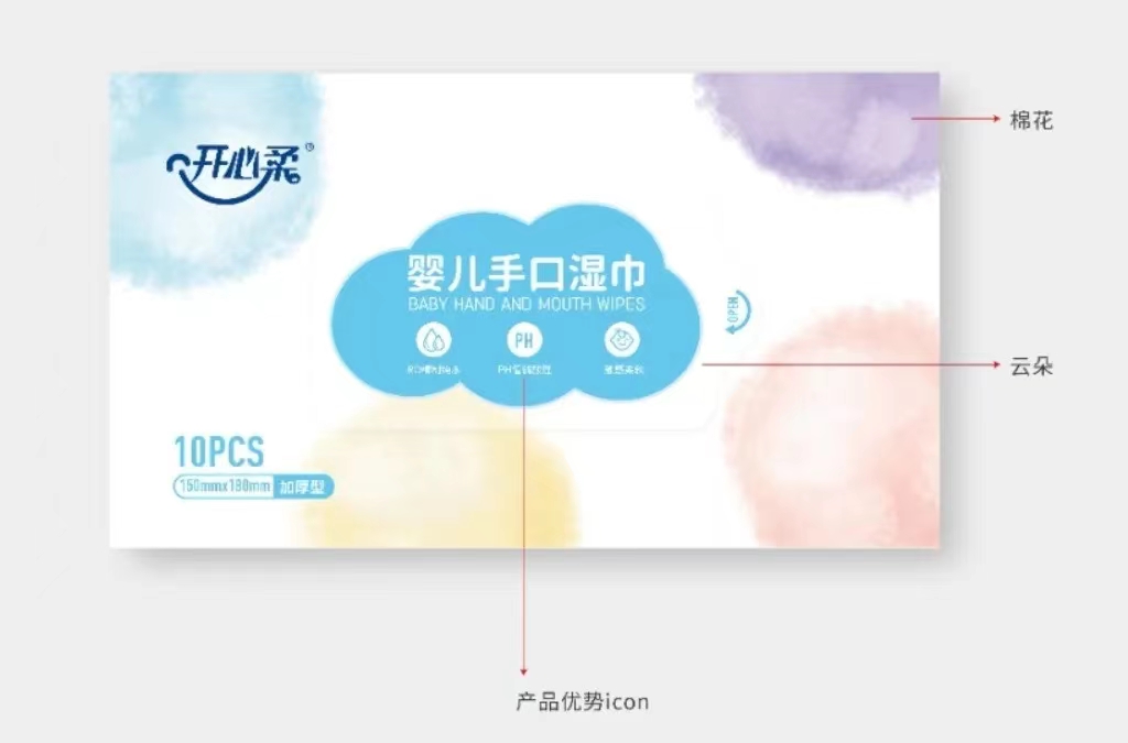 與一般嬰兒濕布相比,嬰兒手口濕巾殺菌和消毒作用更強(qiáng),手口濕巾受到廣大消費(fèi)者的歡迎,開心柔嬰兒手口濕巾采用新型技術(shù),觸感柔軟舒適,PH值更貼近嬌嫩肌膚,為了能夠拉近與消費(fèi)者的距離,擴(kuò)大產(chǎn)品銷量,增強(qiáng)品牌影響力,石特受委托為嬰兒手口濕巾設(shè)計(jì)包裝。