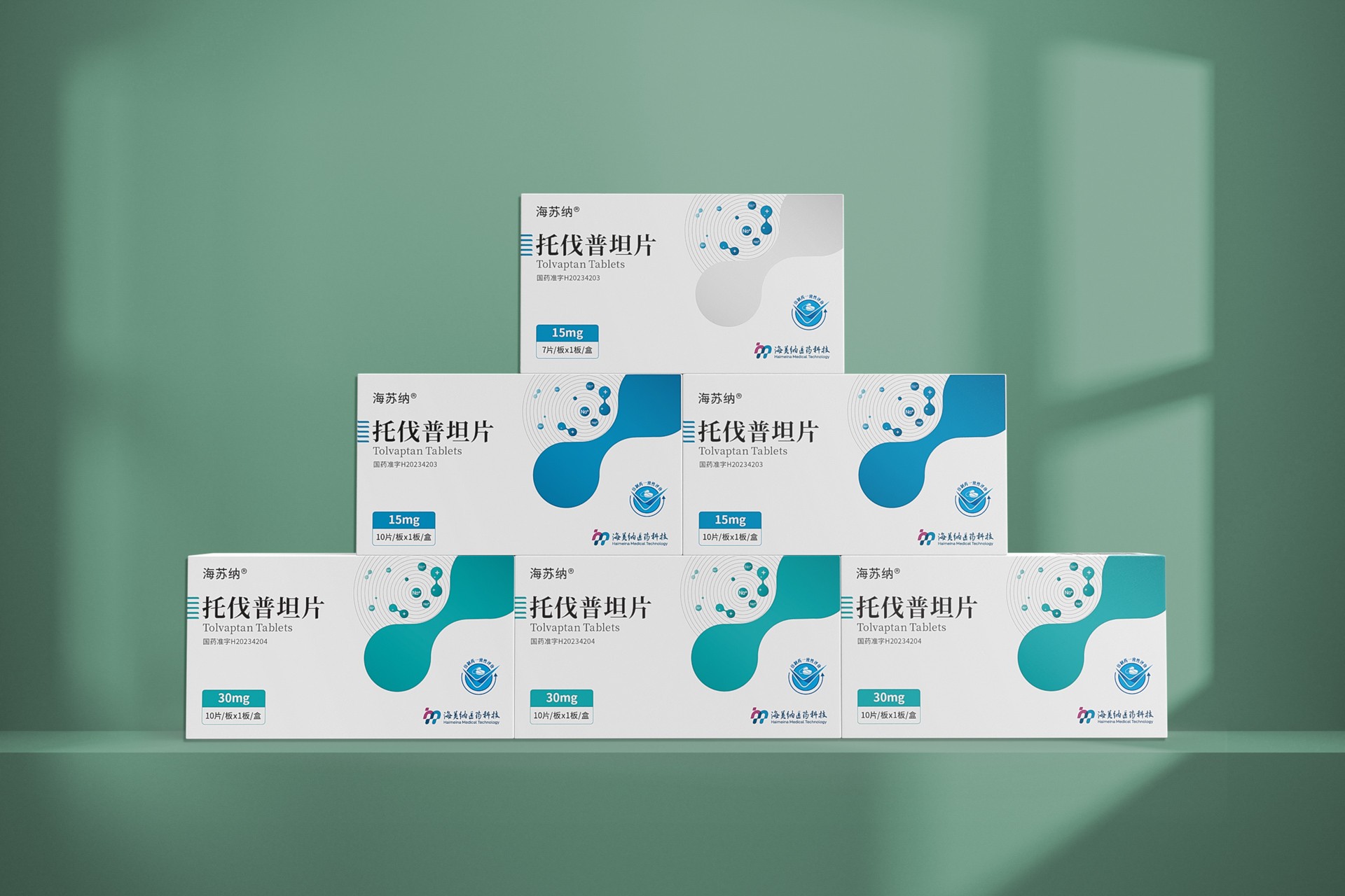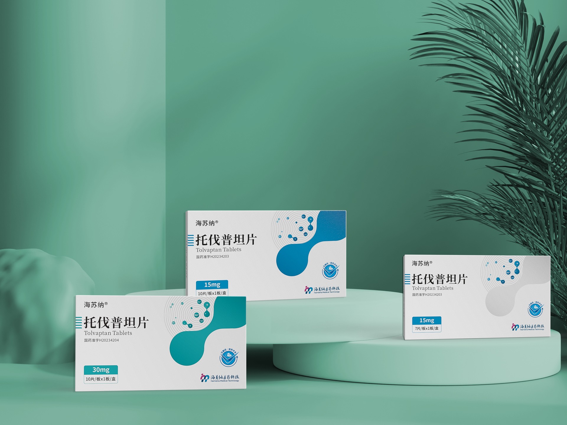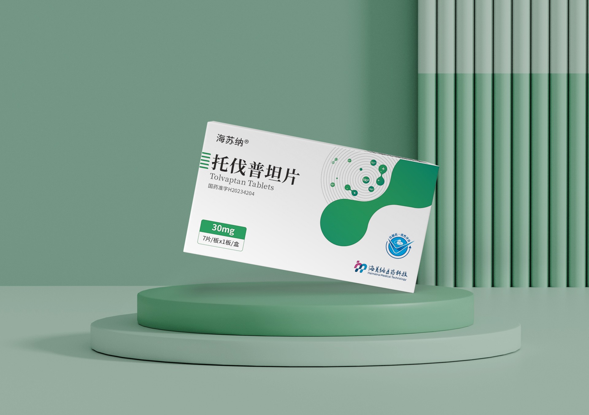 整個包裝盒以白色為主色調,展現出清新、純凈的視覺效果,符合醫療產品的專業形象。在盒子的設計上,巧妙地融入了綠色和藍色的設計元素,不僅為整體設計增添了活力,也與托伐普坦片的醫療屬性相呼應。 包裝盒的正面顯著位置印有“托伐普坦片”的中文和英文標識,字體清晰易讀,便于患者和醫護人員快速識別。同時,藥品的劑量“30mg”以及包裝規格“7片/板×1板/盒”等信息也得以明確標注,確保患者能夠準確了解和使用藥品。 包裝盒下方設計了一個淺綠色的圓形臺座,不僅為藥品提供了穩定的支撐,還增加了整體設計的層次感。背景墻采用淡綠色,并輔以垂直條紋裝飾,為整個包裝增添了現代感和時尚感。在包裝盒的背面或側面,應標注國藥準字、生產廠家、生產日期、有效期等詳細信息,確保患者能夠全面了解藥品的相關信息。 總的來說,托伐普坦片的藥品包裝設計既體現了醫療產品的專業性,又充分考慮了患者的使用體驗。通過簡約而不失設計感的外觀,以及清晰明了的文字信息,該藥品包裝能夠有效地幫助患者識別和使用藥品,提升了產品的整體品質和市場競爭力。