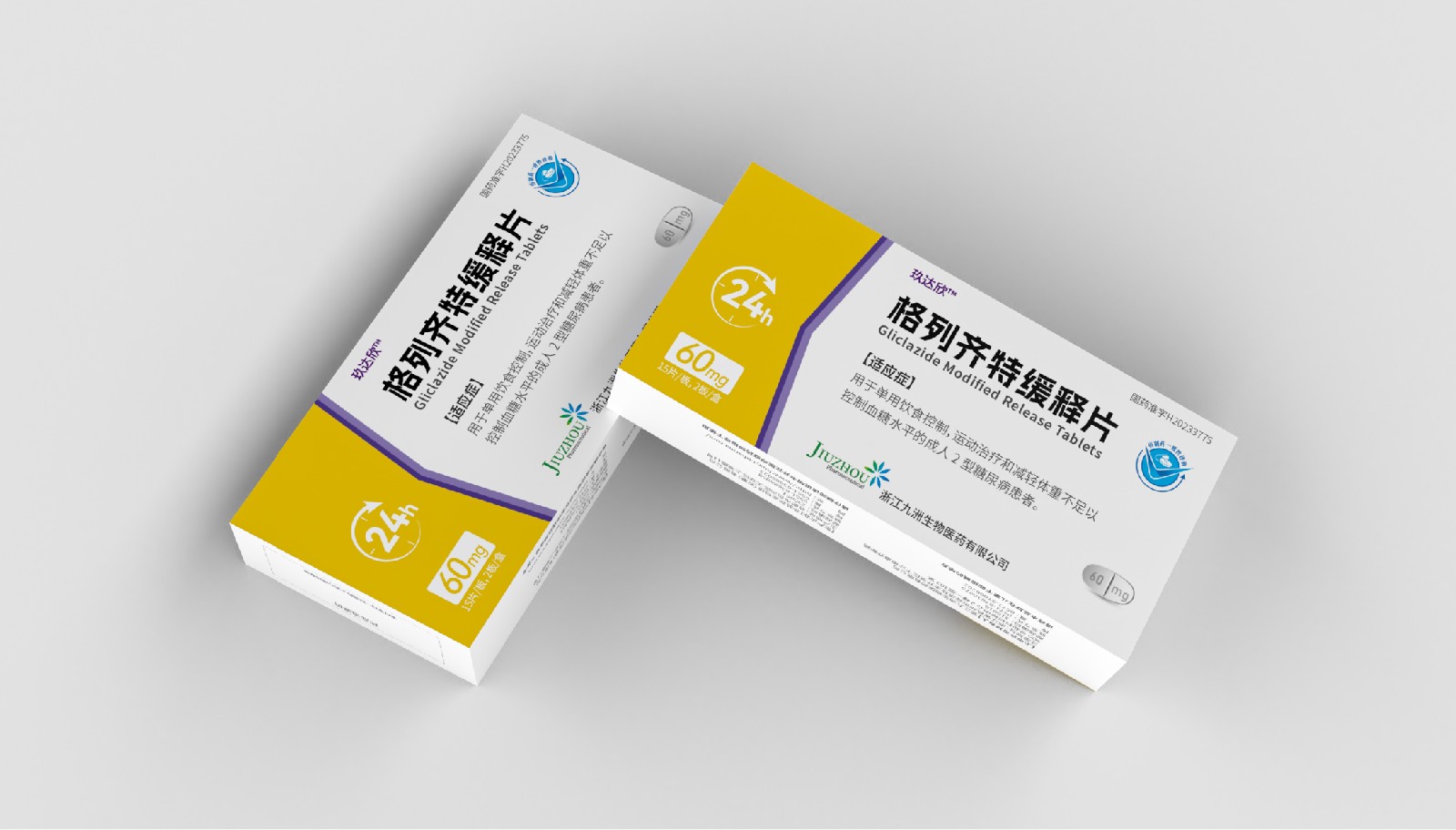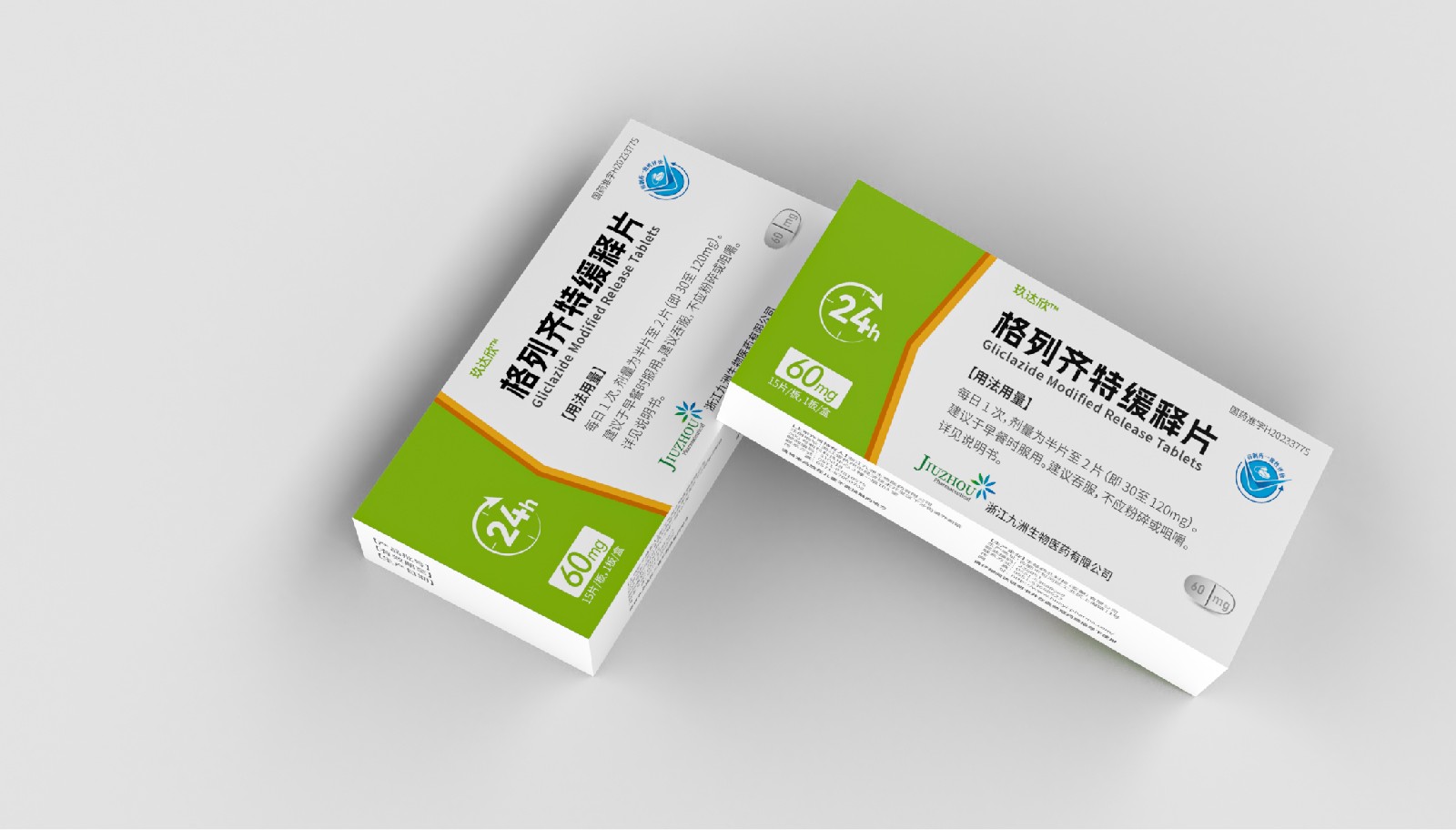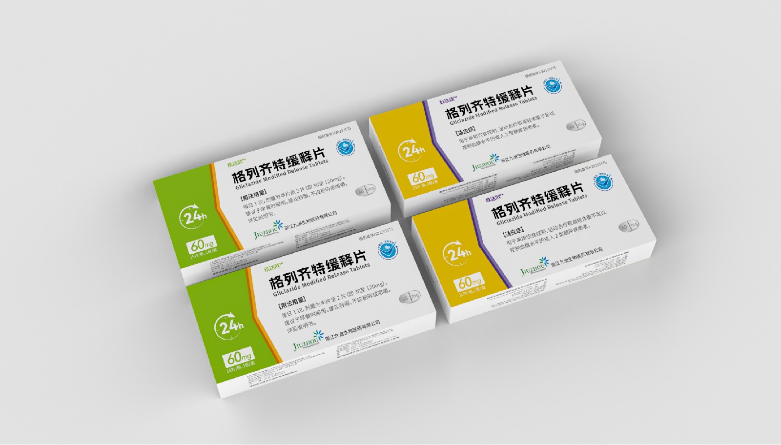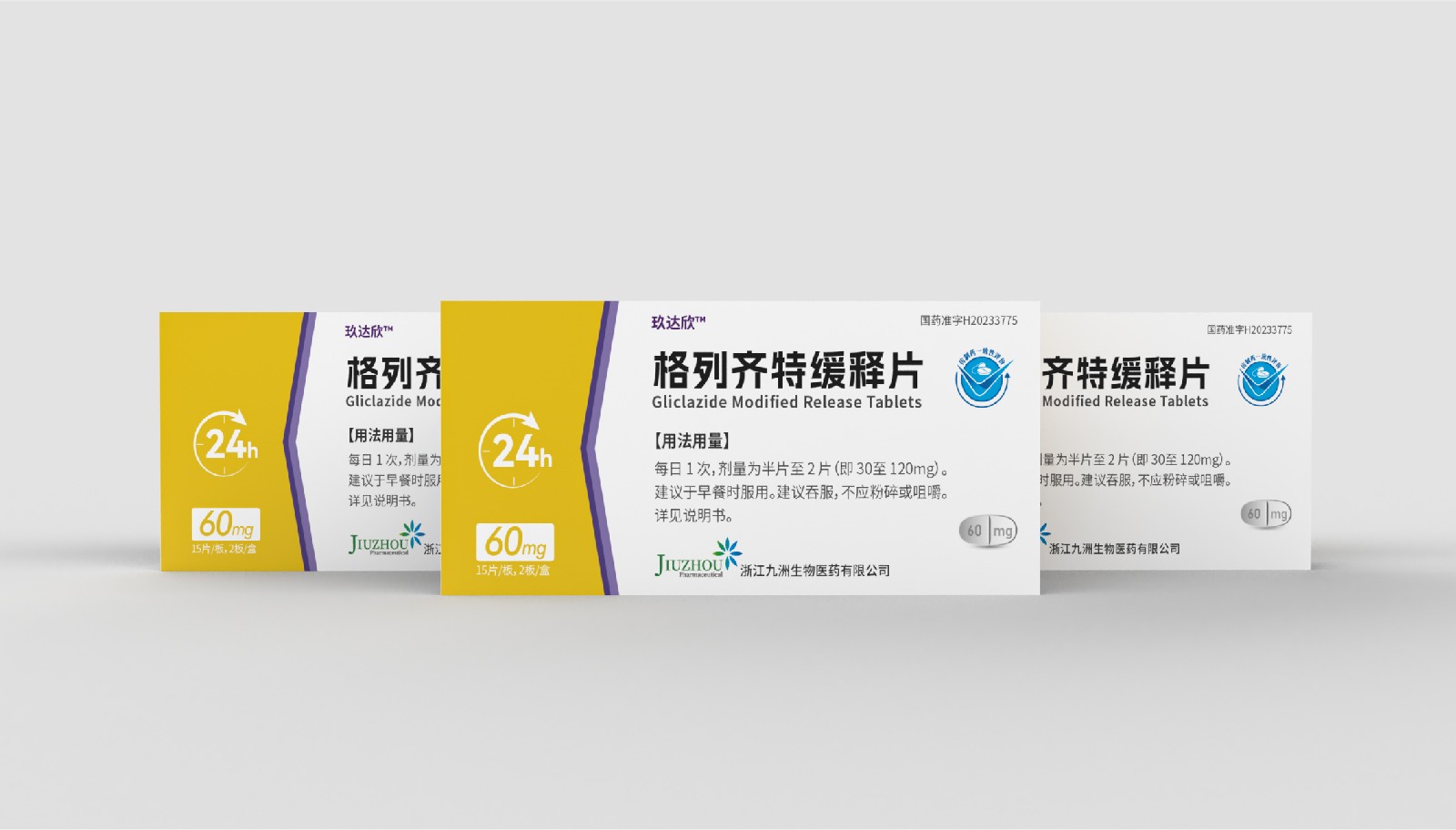設計方案中藥效持續時間作為視覺符號出現,起到強調藥突出作用。強調用法用量與藥效持續時間數字“1”、“24”做傾斜處理體現速度感,在起到突出強調的同時,也體現藥片控制血糖速度之感。企業標志和企業名稱結合使用突出企業形象。藥片設計突出單片藥劑量和藥片可掰片使用。