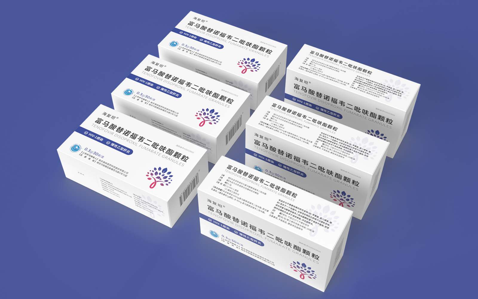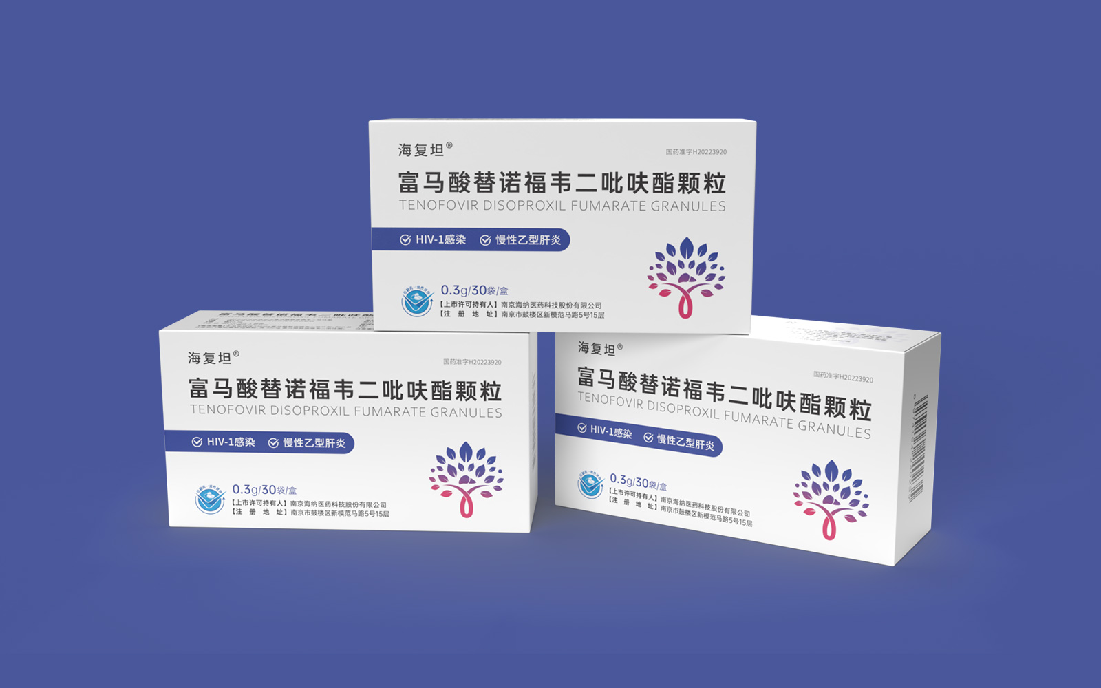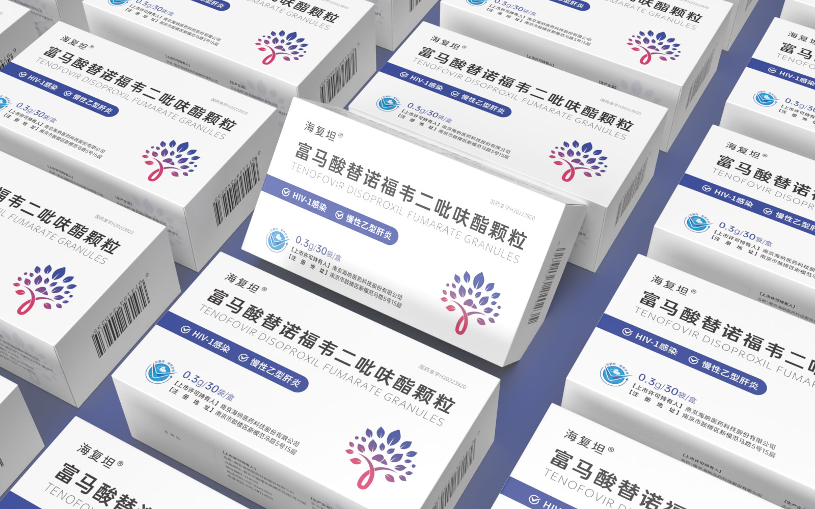 主視覺由HIV標識、肝、大樹、雙手結(jié)合設(shè)計呈大樹形主圖案。HIV》標識\肝臟標識突出產(chǎn)品適應(yīng)癥,大樹/樹葉寓意健康、生命和安全,象征成長新生的希望之樹。雙手捧著代表呵護與關(guān)愛,象征著企業(yè)以人為本/以健康關(guān)愛為本。主視覺采用冷暖色漸變,藍色醫(yī)療屬性強烈,代表醫(yī)療健康、冷靜,粉紅色既有主治癥狀HIV標識及肝部的色彩表現(xiàn)同時也代表著疼痛深藍到粉紅的處理方式.表現(xiàn)一種正在緩解及治療病狀的過程。
