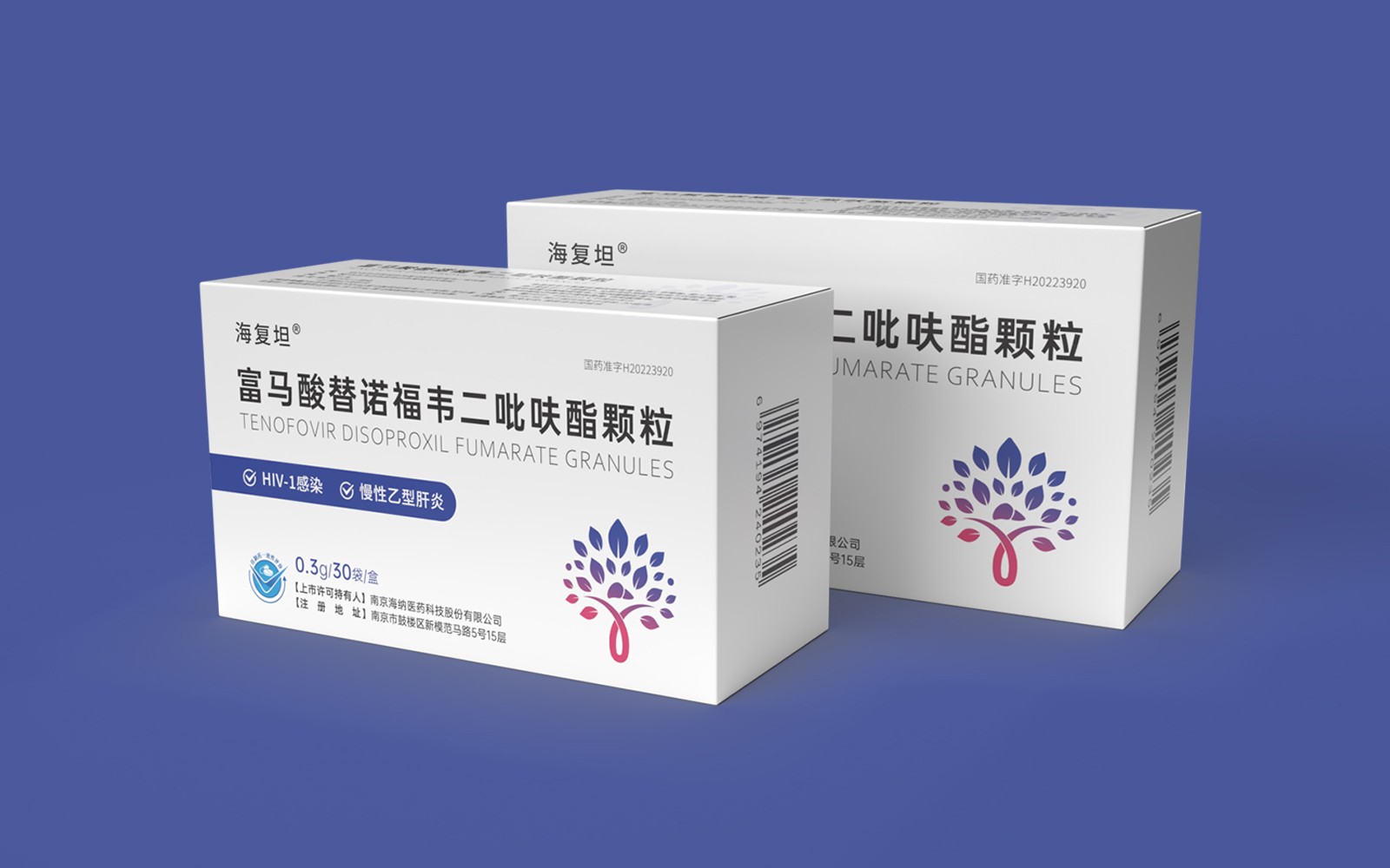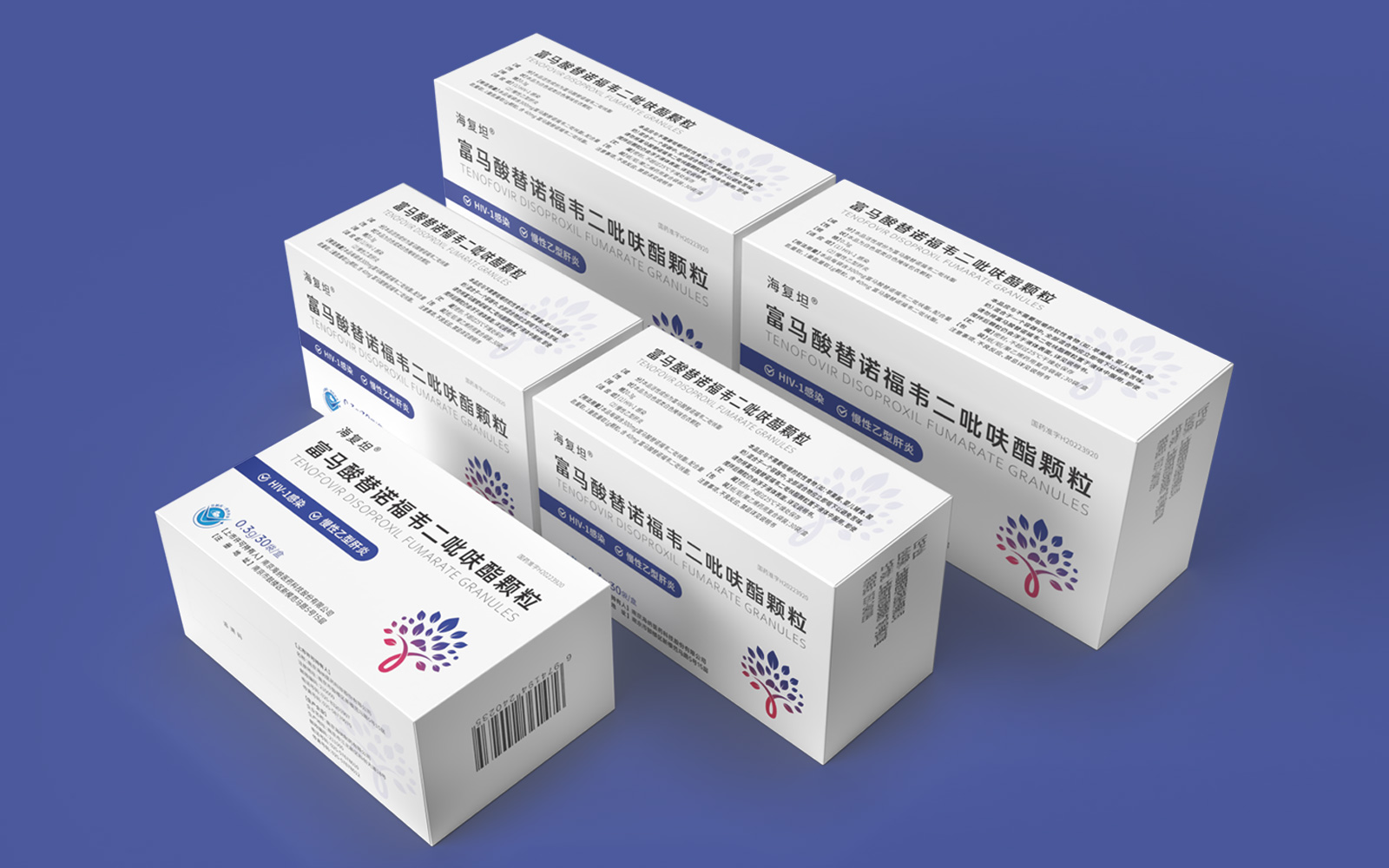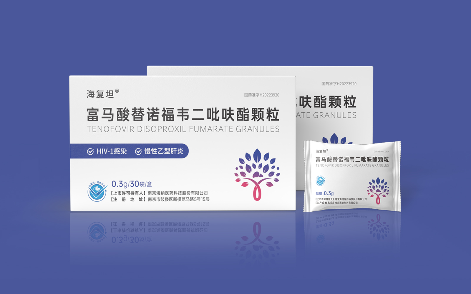 主視覺由HIV標識、肝、大樹、雙手結(jié)合設(shè)計呈大樹形主圖案。HIV》標識\肝臟標識突出產(chǎn)品適應(yīng)癥,大樹/樹葉寓意健康、生命和安全,象征成長新生的希望之樹。雙手捧著代表呵護與關(guān)愛,象征著企業(yè)以人為本/以健康關(guān)愛為本。主視覺采用冷暖色漸變,藍色醫(yī)療屬性強烈,代表醫(yī)療健康、冷靜,粉紅色既有主治癥狀HIV標識及肝部的色彩表現(xiàn)同時也代表著疼痛深藍到粉紅的處理方式.表現(xiàn)一種正在緩解及治療病狀的過程。
