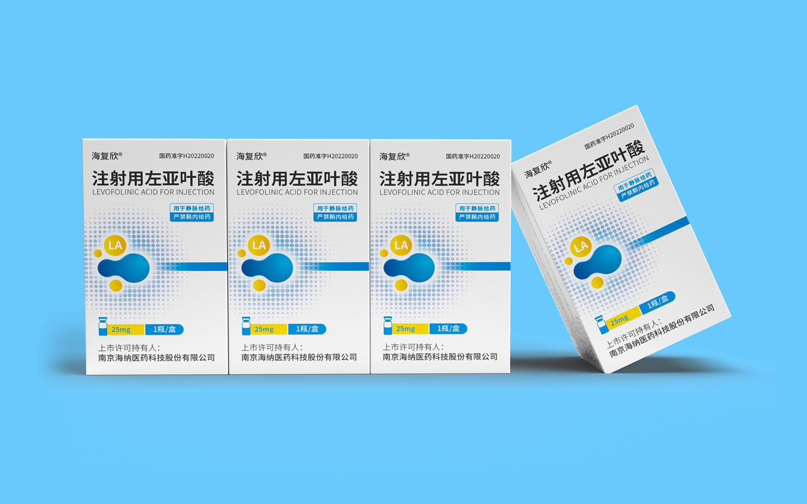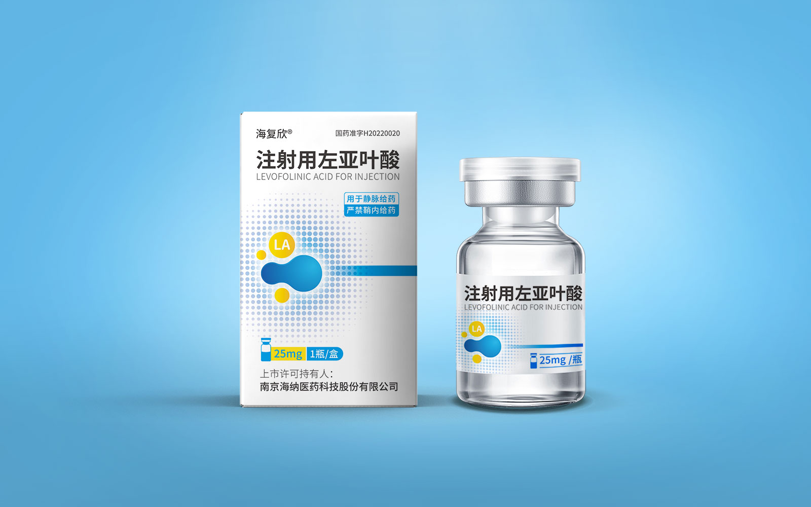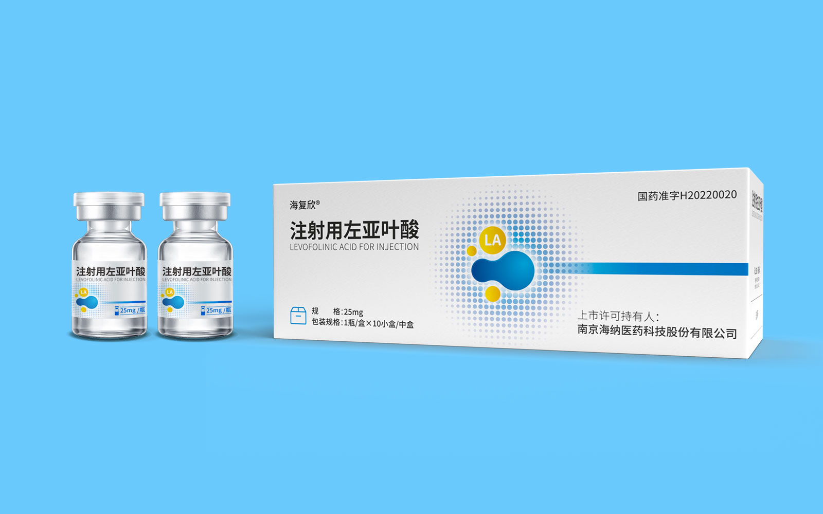 色彩運用上,藍色具有極強的醫(yī)藥行業(yè)專屬性,同時藍色安靜舒適,益于舒緩情緒,保持平靜。黃色為藥品粉末顏色,與本藥品特性相呼應,整體顏色簡約醒目。LA左亞葉酸首字母縮寫;同時體現藥品具有預防腫瘤、抑制腫瘤增殖和再生的作用的應用途徑,加強對藥品的認知與記憶。擴散波點以漸變擴散波點的形式凸顯產品快速起效的特點。