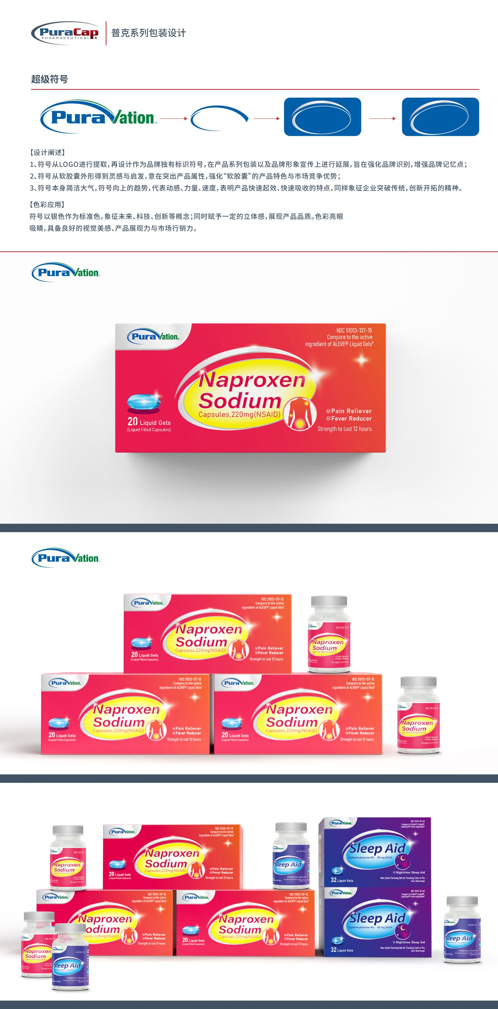 1符號從LOGO進行提取,再設計作為品牌獨有標識符號,在產品系列包裝以及品牌形象宣傳上進行延展,旨在強化品牌識別,增強品牌記憶點;符號從軟膠囊外形得到靈感與啟發,意在突出產品屬性,強化“軟膠囊”的產品特色與市場競爭優勢;符號本身簡潔大氣,符號向上的趨勢,代表動感、力量、速度,表明產品快速起效、快速吸收的特點,同樣象征企業突破傳統,創新開拓的精神。符號以銀色作為標準色,象征未來、科技、創新等概念;同時賦予一定的立體感,展現產品品質。色彩亮眼吸睛,具備良好的視覺美感、產品展現力與市場行銷力。