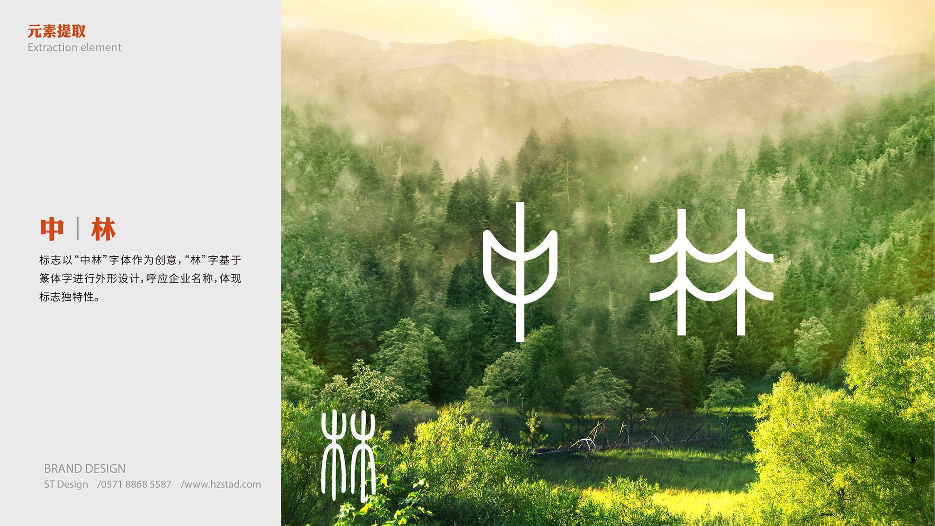 標志以“中林”字體作為創意,林字基于篆體字進行外形設計,有兩重涵義,一是代表兩棵相連的樹,寓意森林生態;二是如兩個牽手的人,代表人與自然和諧共處,代表企業基于林業,積極推動產業互融,促進家民創富增收,實現鄉村振興。