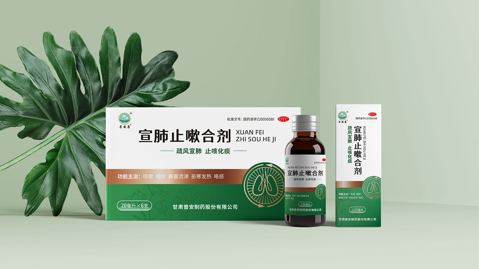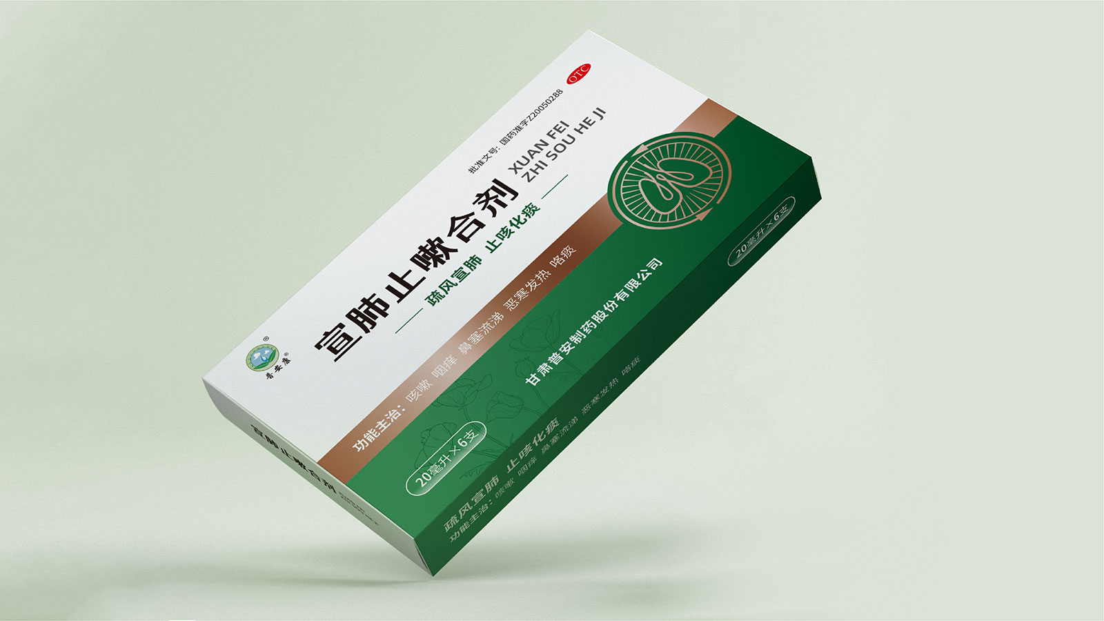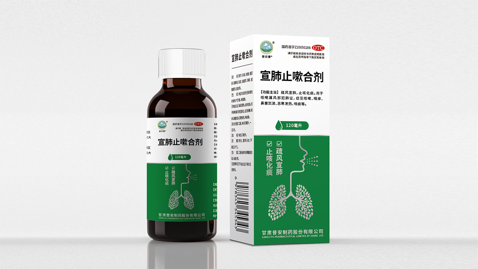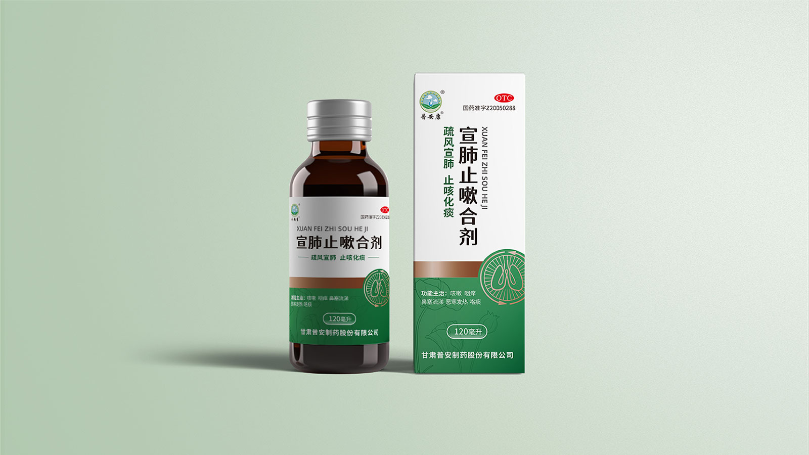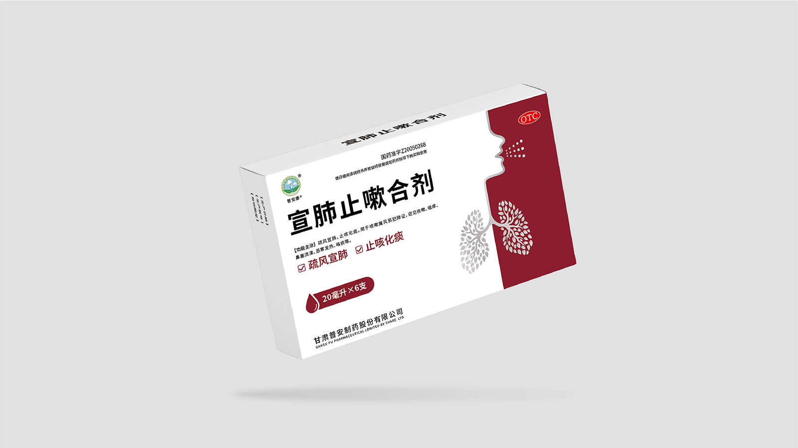包裝整體風(fēng)格以極簡(jiǎn)為主,在凸出產(chǎn)品通用名的同時(shí),將產(chǎn)品核心主治功能——疏風(fēng)宣肺、止咳化痰以簡(jiǎn)潔圖案展示于畫面,并作為畫面核心視覺(jué)元素。產(chǎn)品成分以中草藥為主,又聯(lián)想到產(chǎn)品功能主治特征,顧將兩者結(jié)合,用代表中草藥的樹(shù)葉和肺的整體形態(tài)進(jìn)行融合、替換,凸顯產(chǎn)品中成藥屬性,將肺、呼吸道、人物側(cè)臉剪影和代表呼吸感的小點(diǎn)相結(jié)合,呼應(yīng)產(chǎn)品主治功能特征。考慮到產(chǎn)品性狀為液體形態(tài),因此將代表液體的水滴形態(tài)融合畫面和產(chǎn)品規(guī)格相結(jié)合,并做強(qiáng)調(diào)處理,凸顯產(chǎn)品性狀的同時(shí)以便于消費(fèi)者準(zhǔn)確查看及區(qū)分產(chǎn)品不同規(guī)格。