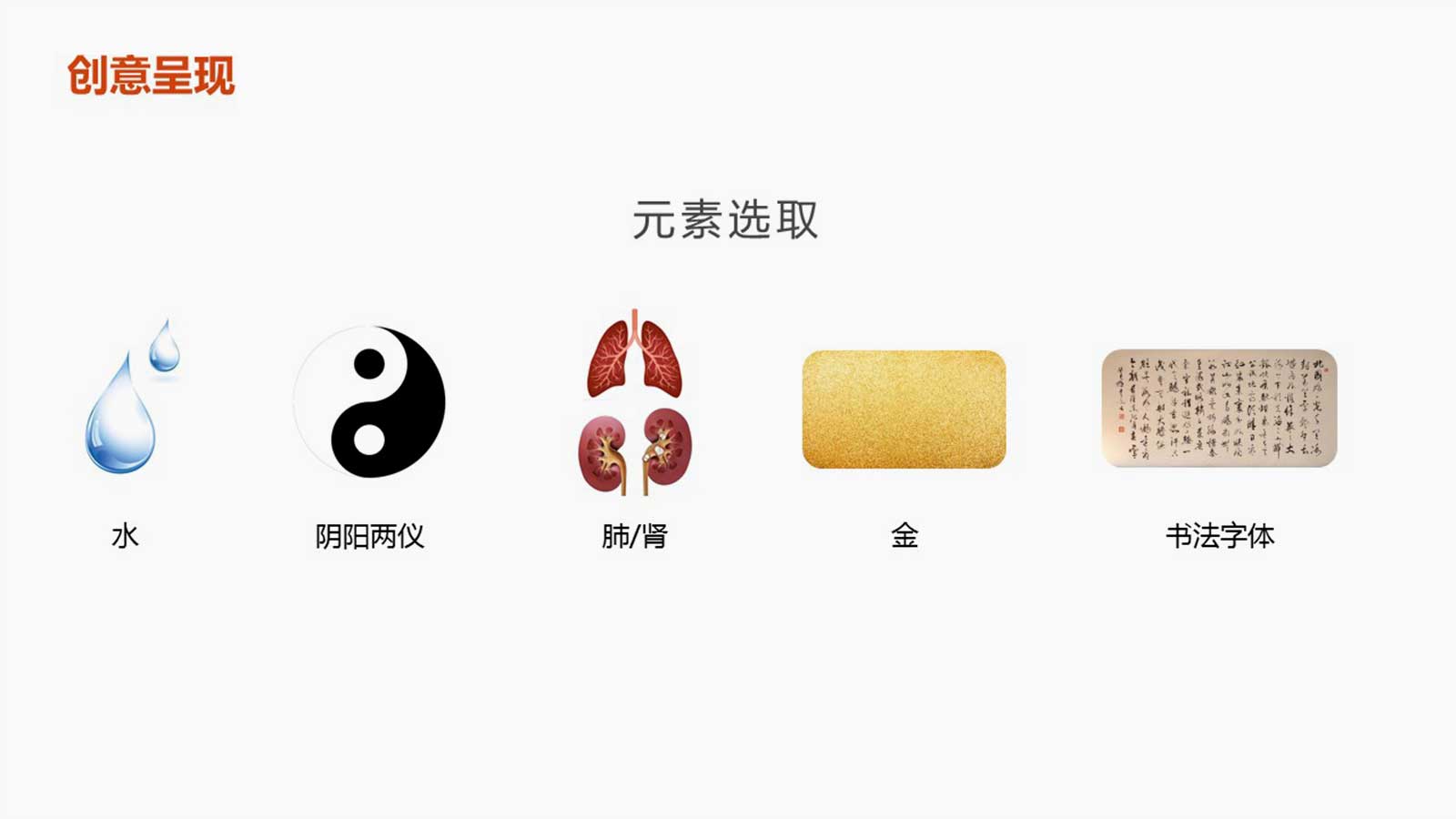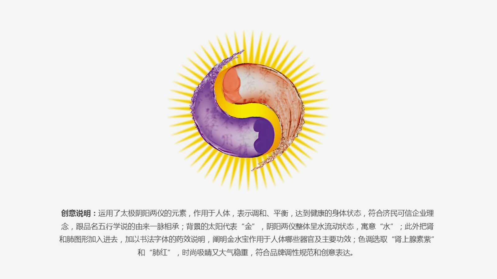 運用了太極陰陽兩儀的元素,作用于人體,表示調和、平衡,達到健康的身體狀態,符合濟民可信企業理念,跟品名五行學說的由來一脈相承;背景的太陽代表“金”,陰陽兩儀整體呈水流動狀態,寓意“水”;此外把腎和肺圖形加入進去,加以書法字體的藥效說明,闡明金水寶作用于人體哪些器官及主要功效;色調選取“腎上腺素紫”和“肺紅”,時尚吸睛又大氣穩重,符合品牌調性規范和創意表達。