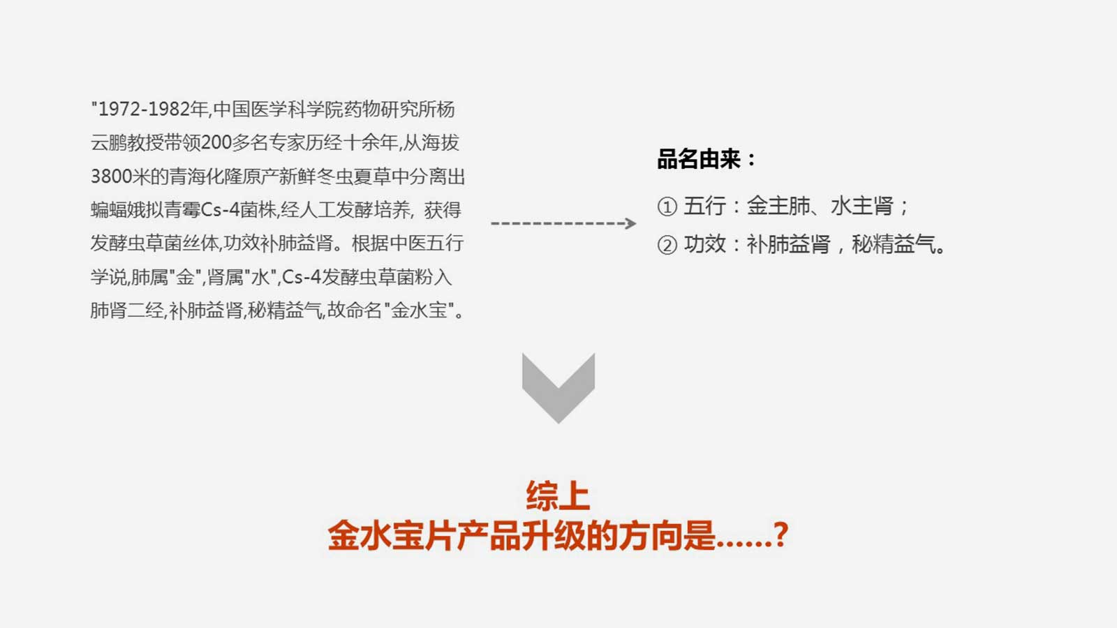 1972-1982年,中國醫學科學院藥物研究所楊云鵬教授帶領200多名專家歷經十余年,從海拔3800米的青海化隆原產新鮮冬蟲夏草中分離出蝙蝠娥擬青霉Cs-4菌株,經人工發酵培養, 獲得發酵蟲草菌絲體,功效補肺益腎。根據中醫五行學說,肺屬"金",腎屬"水",Cs-4發酵蟲草菌粉入肺腎二經,補肺益腎,秘精益氣,故命名"金水寶"。