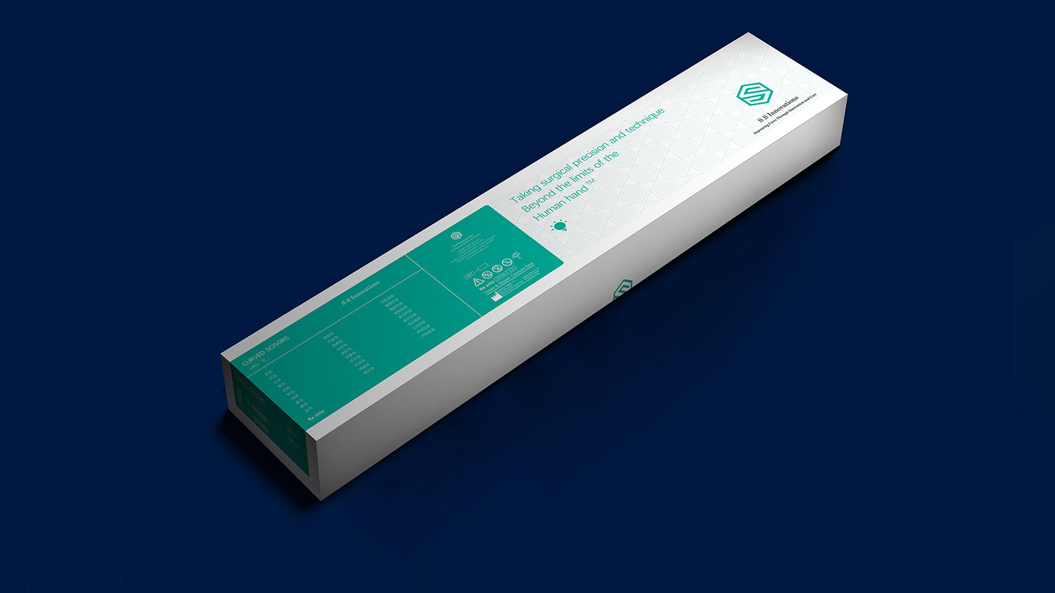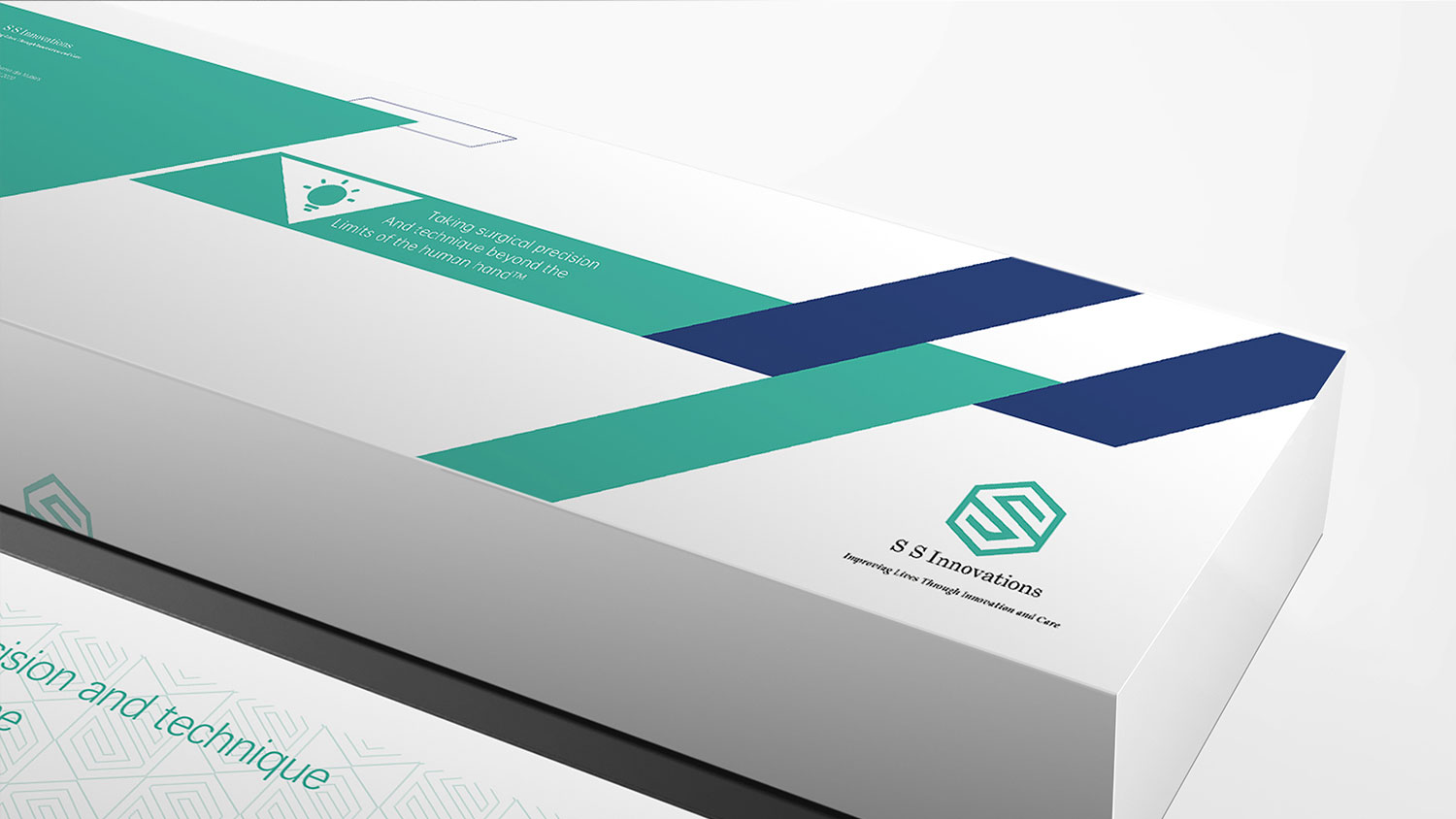 石特根據其品牌的產品特點及品牌理念,為其進行機器人醫療機械包裝設計。整體以品牌主色調藍綠色為主,白色做基調,利用品牌LOGO“S”的直角形狀與六邊形相結合,描繪輪廓,可形成大面積的淺色底紋,加強品牌視覺效果,體現技術嚴謹且有序;六邊形組成間的三角形看似平平無奇,眾所周知三角形是最穩固的形狀,體現制造技術安全穩定,整體簡約而不簡單。
