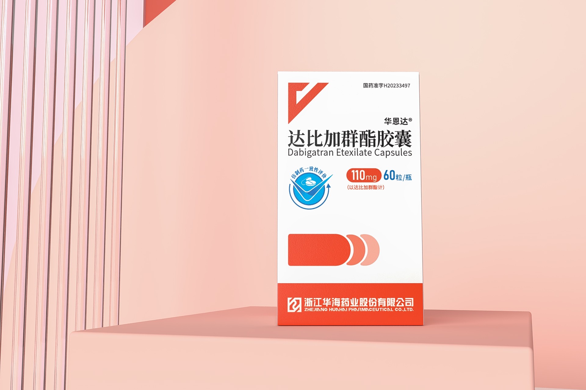 包裝設計特點 色彩運用: 達比加群酯膠囊的包裝盒采用了粉紅色和灰色相間的條紋作為背景,這種設計不僅美觀大方,還能在視覺上給人一種舒適、溫馨的感覺。同時,粉紅色和灰色都是較為中性的顏色,不會過于刺眼或單調,符合藥品包裝的審美要求。 文字排版: 包裝盒正面中央的白色文字“達比加群酯膠囊”字體清晰、大小適中,易于閱讀。下方標注的藥物名稱“Dabigatran Etexilate Capsules”以及劑量“110mg/60粒”同樣采用了清晰易讀的字體,方便患者了解藥品的基本信息。 標志設計: 包裝盒左上角的白色標志中,紅色的V形圖案和“華海藥業”字樣相得益彰,不僅突出了企業的品牌形象,還增強了藥品的可信度。標志的設計簡潔明了,符合現代審美趨勢。 整體風格: 整個包裝盒的設計簡潔現代,以白色為主色調,配以紅色和灰色的點綴,營造出一種專業和可靠的感覺。這種設計風格不僅符合藥品包裝的規范,還能提升藥品的檔次和形象。 三、信息傳遞與品牌形象 信息傳遞: 包裝盒上詳細標注了藥品的名稱、劑量、批準文號(國藥準字H20233497)、生產廠家(浙江華海藥業股份有限公司)等信息,方便患者和醫務人員了解和使用。同時,包裝盒上的文字排版清晰明了,避免了信息混淆和誤解的情況發生。 品牌形象: 通過簡潔現代的包裝設計和清晰易讀的信息傳遞,達比加群酯膠囊的藥品包裝成功塑造了企業專業、可靠的品牌形象。這種品牌形象不僅有助于提升患者對藥品的信任度和滿意度,還能為企業帶來更好的市場口碑和競爭力。