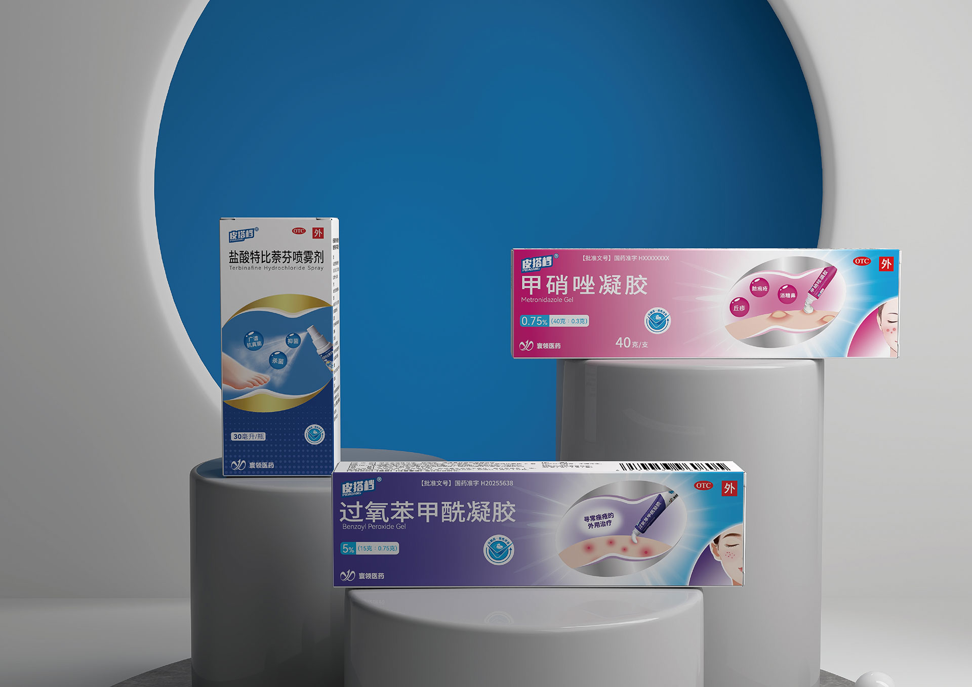 功能差異化與統(tǒng)一性的矛盾:甲硝唑凝膠(祛痘/抗炎)、鹽酸特比萘芬噴霧劑(抗真菌)、過氧苯甲酰凝膠(祛痘/殺菌)分屬不同治療領域,包裝需在統(tǒng)一家族感下,清晰傳遞各自的功能差異。