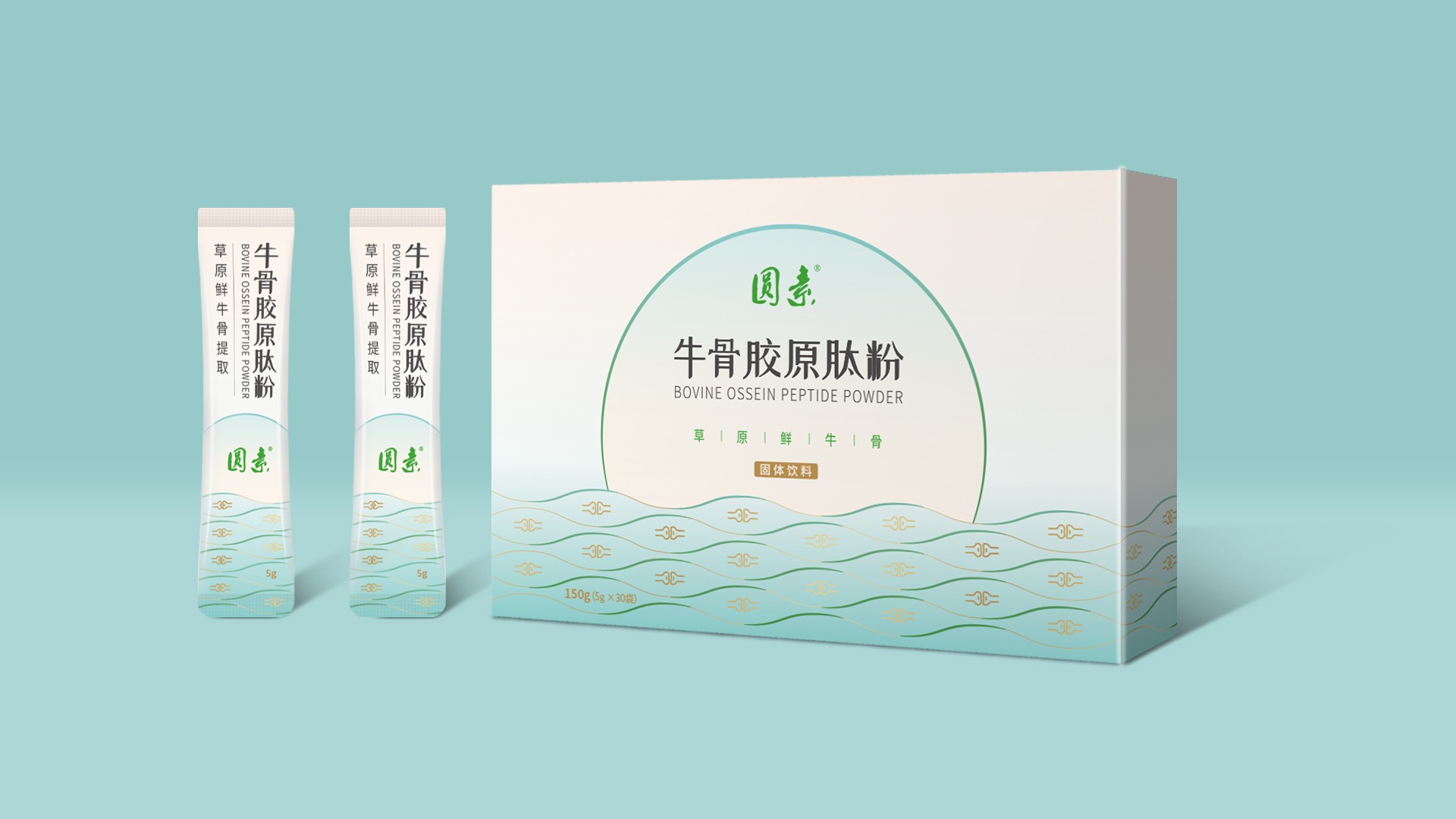 在著手“圓素”牛骨膠原肽粉的包裝設(shè)計時,石特前期做足了充分的調(diào)研,我們了解到該產(chǎn)品以草原牛骨為原料,具有分子量小、純度高、水溶性好的特性,地域性特征十分明顯,