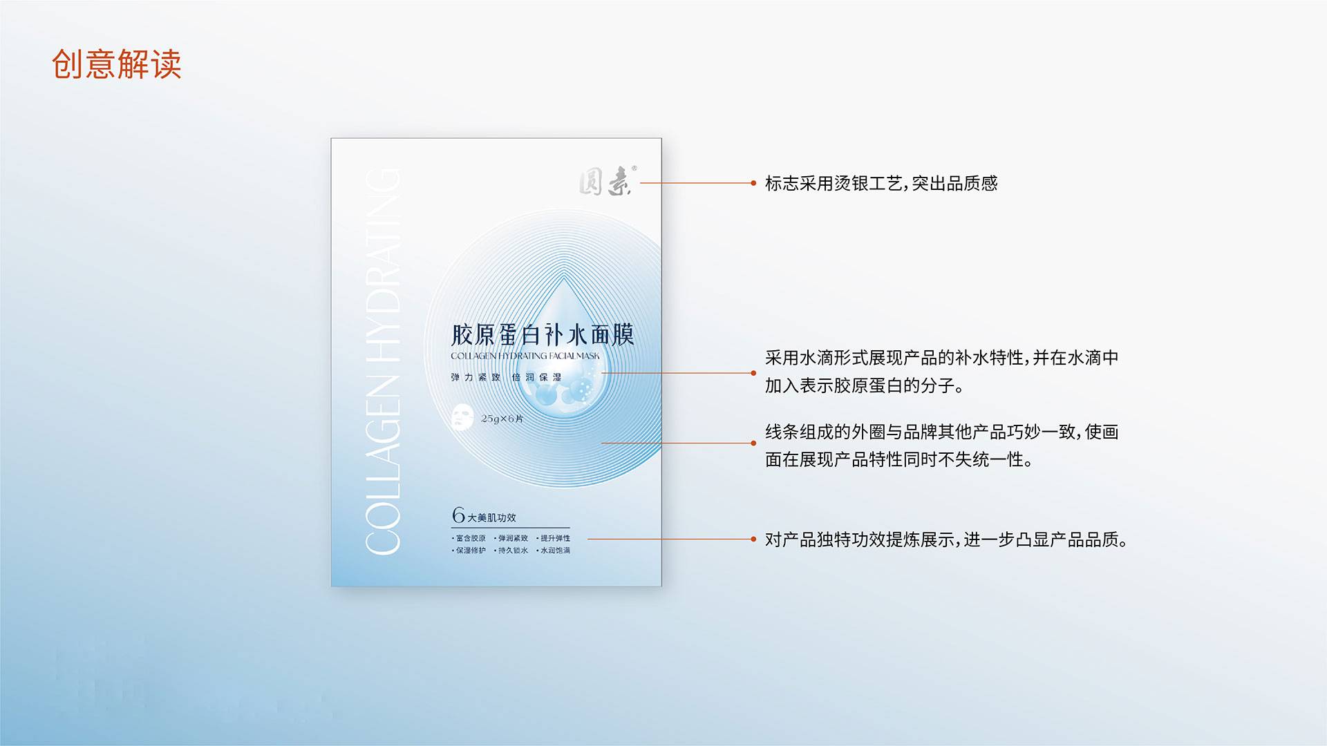 經(jīng)過前期的調(diào)研及分析,石特了解到該款產(chǎn)品甄選優(yōu)質(zhì)膠原蛋白精華,具有補(bǔ)水鎖水等功效,基于此,我們提出了新的包裝創(chuàng)意:面膜的包裝在突出產(chǎn)品通用名的同時,將透亮的水滴作為主畫面,在水滴之中融入膠原蛋白分子,進(jìn)而凸顯面膜補(bǔ)水鎖水的特性;包裝選用淡藍(lán)、白為主色調(diào),整體設(shè)計簡約,給人清爽,潔凈的感覺。